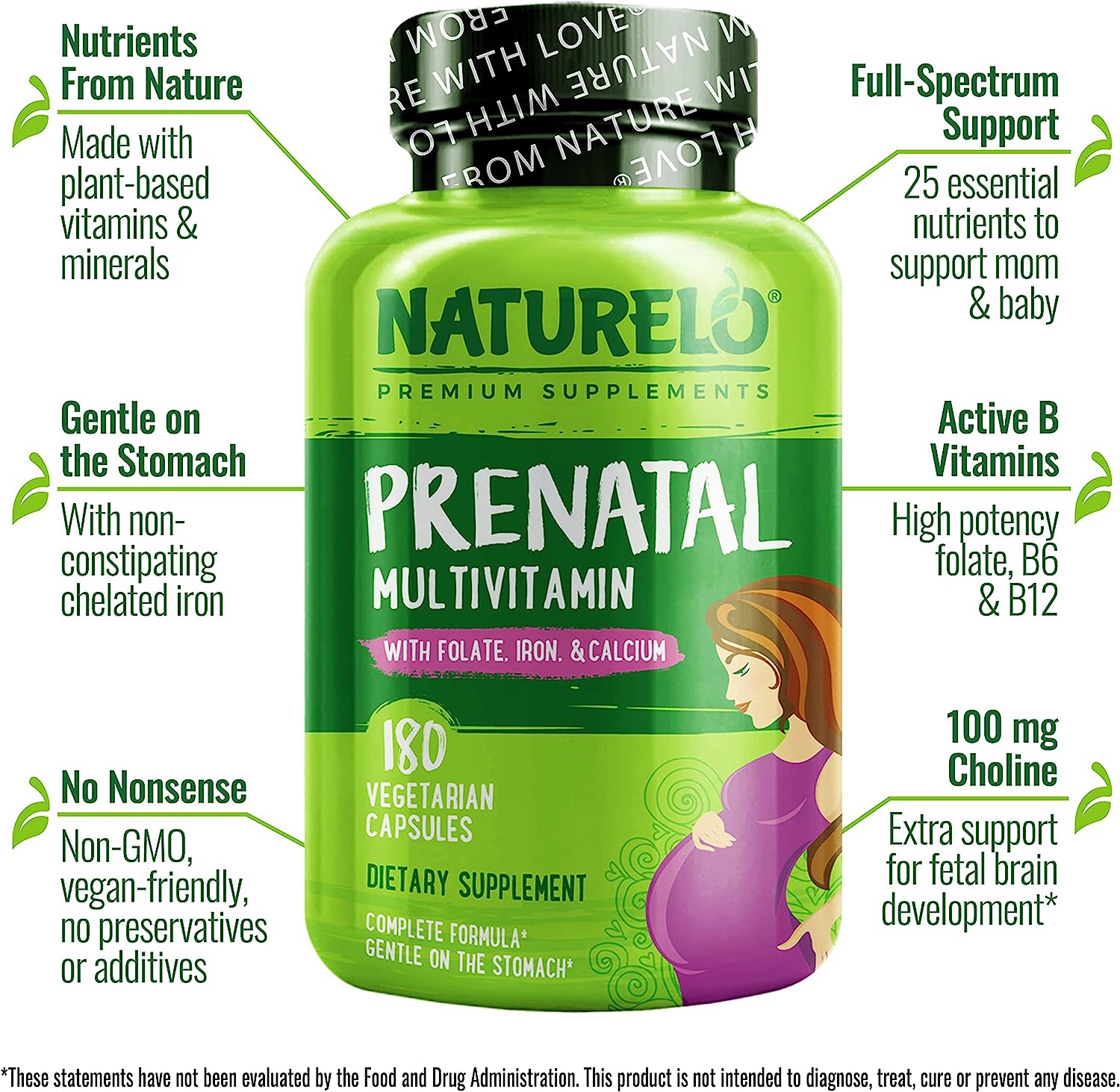 NATURELO Prenatal Multivitamin with Gentle Chelated Iron, Methyl Folate, Plant Calcium & Choline - 180 capsules
