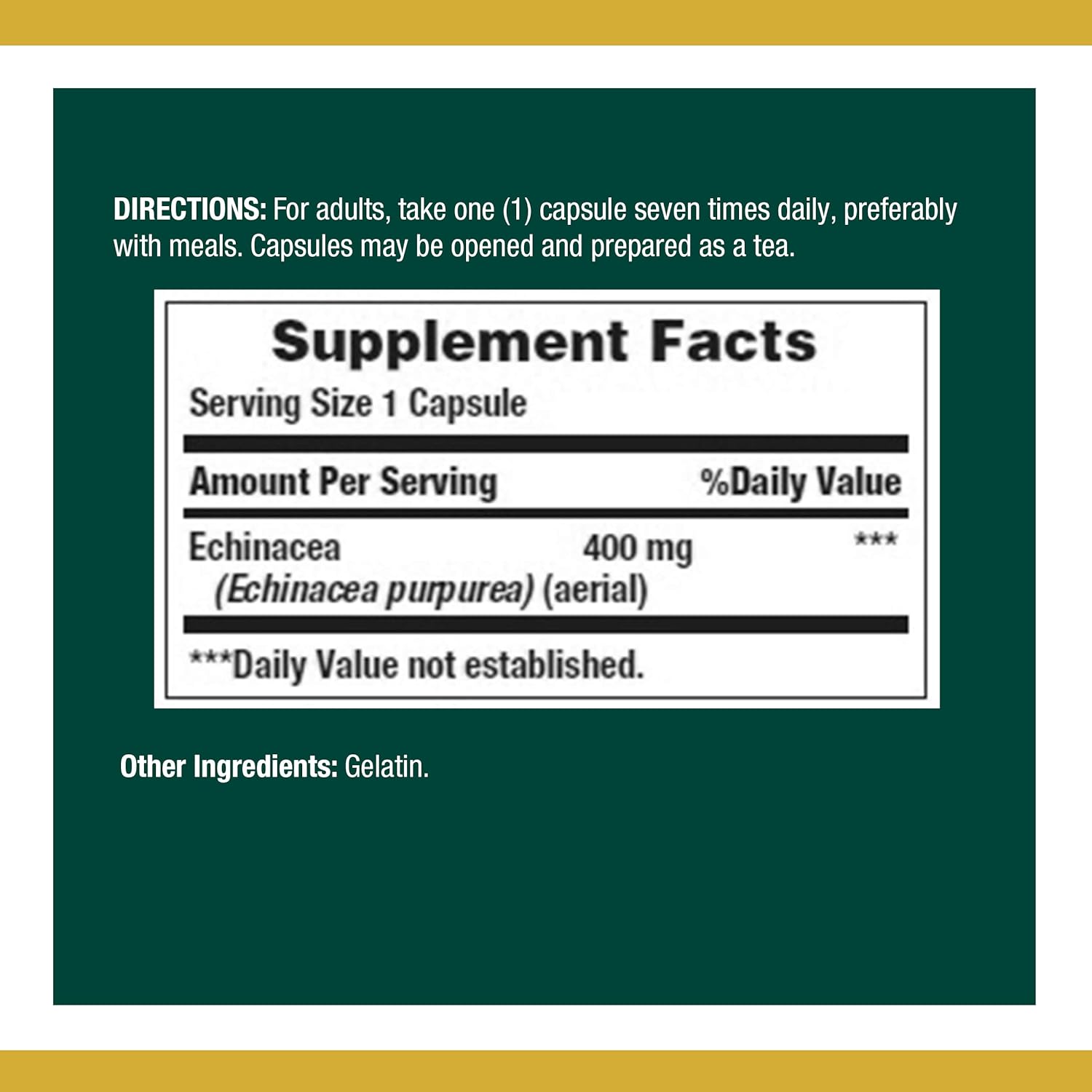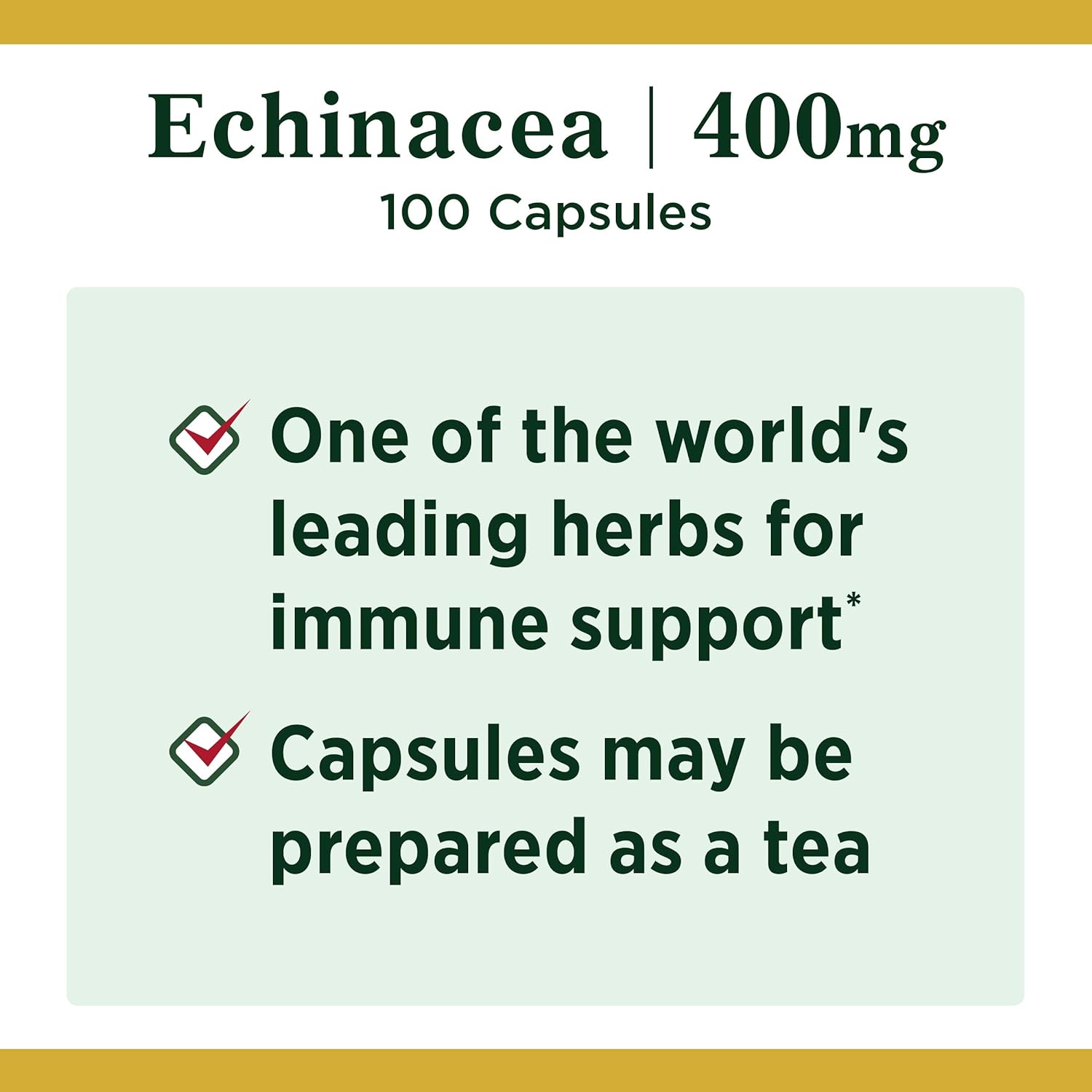 - A LEADING HERB FOR IMMUNE SUPPORT: : 100-count, 400mg Echinacea: Echinacea is one of the world’s leading herbs used for immune support and overall wellness.Take Nature’s Bounty Echinacea capsules as a holistic way to support the immune system