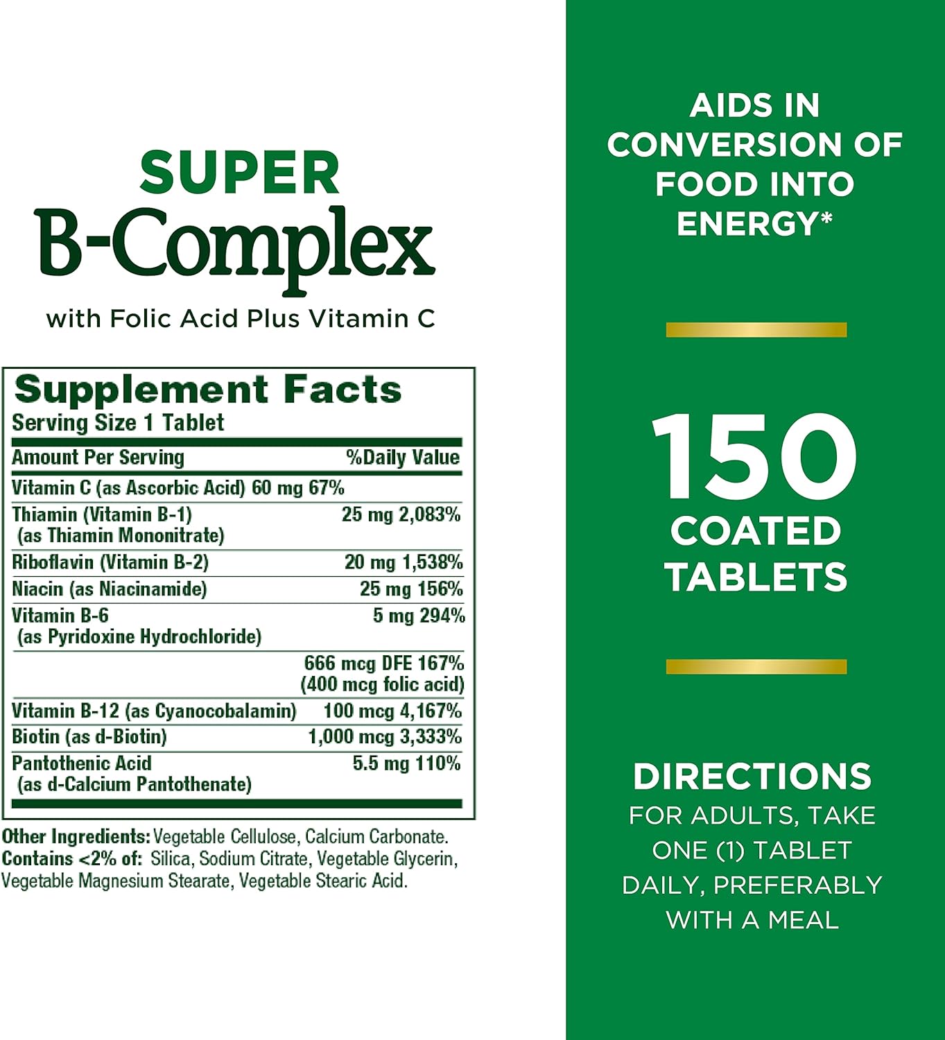 - FOR ENERGY: 150-count Coated Tablets; Nature’s Bounty Super B-Complex with Folic Acid Plus Vitamin C plays an important role in energy metabolism in the body(1); Helps the body convert food into the fuel which is used to maintain energy(1)