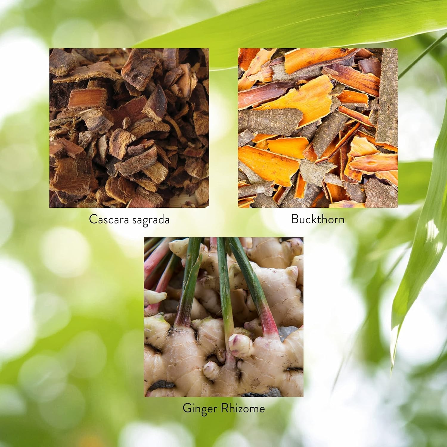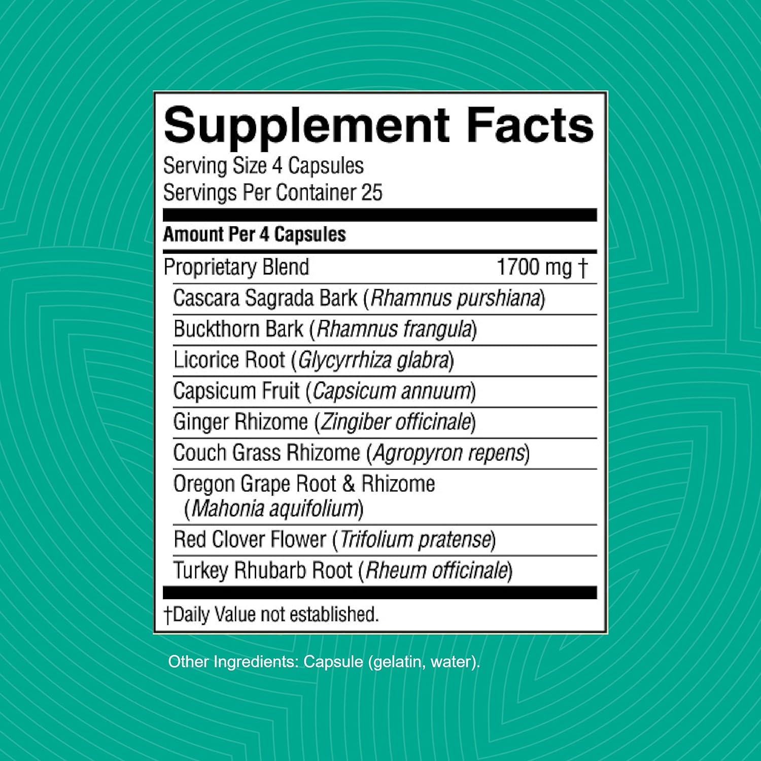 Cascara sagrada bark, buckthorn bark, licorice root, capsicum fruit, ginger rhizome, Oregon grape root and rhizome, Turkey rhubarb root, couch grass rhizome and red clover flowers