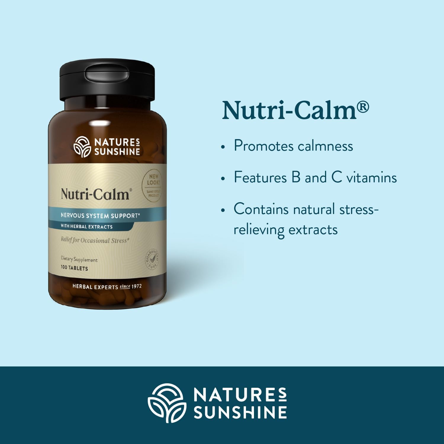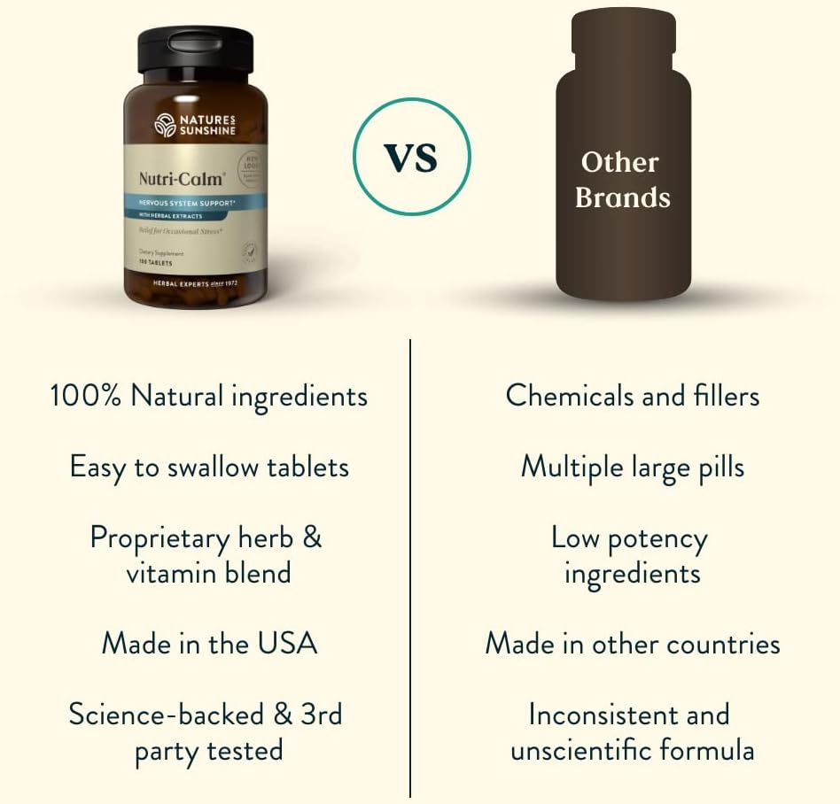 - NERVOUS SYSTEM SUPPORT - Nature’s Sunshine Nutri-Calm supports nerve function, energy, and brain health. With herbal extracts, vitamin C, and B-Complex vitamins, promote relaxation, clarity, and optimal function.