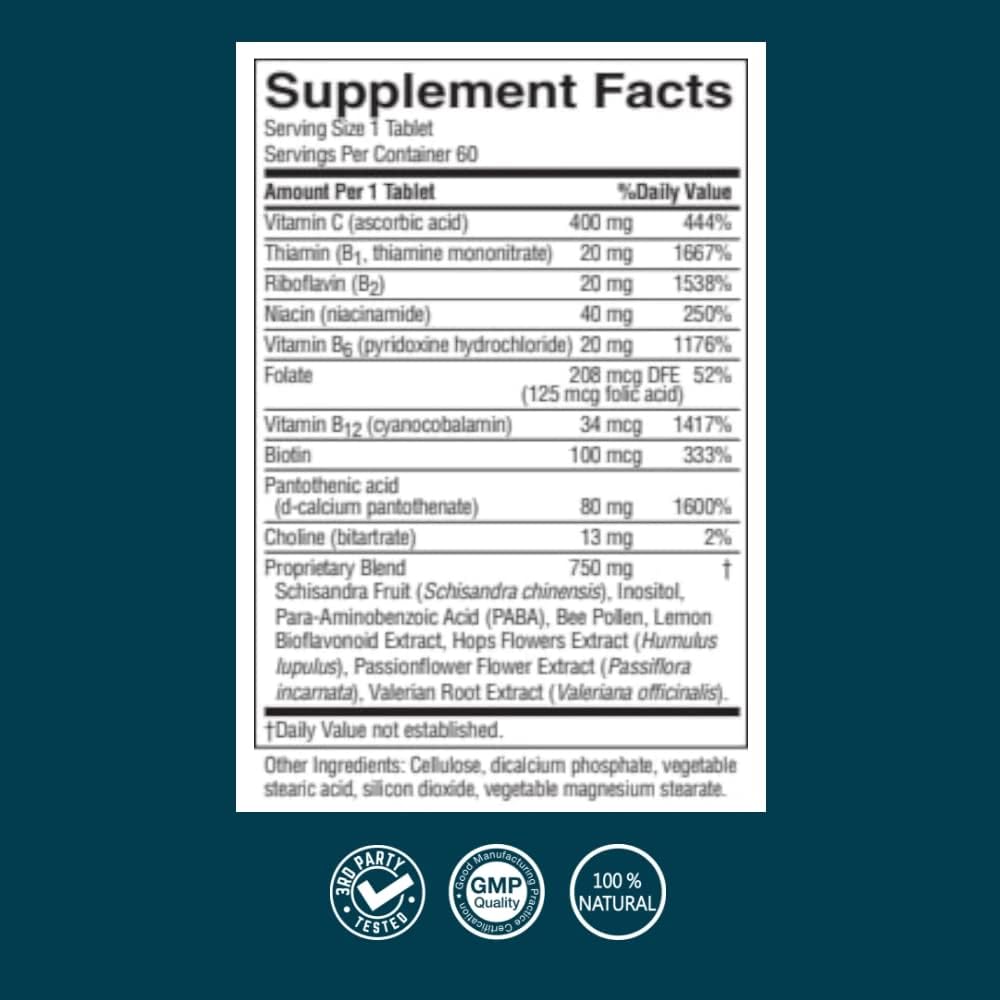 Provides vitamin C, thiamin (B1), riboflavin (B2), niacin, B6, folic acid, B12, biotin and pantothenic acid, plus schizandra fruit, choline, inositol, bee pollen, PABA, lemon bioflavonoids, valerian root extract, passionflower flowers extract and hops flower