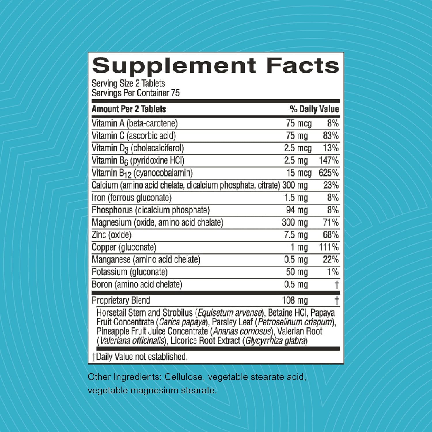 Contains vitamin C, vitamin B6, vitamin B12 Also contains vitamin A, vitamin D, calcium, iron, phosphorus, magnesium, zinc, copper, manganese, potassium, boron, horsetail stems, betaine HCl, papaya fruit, parsley leaves, pineapple fruit, valerian root