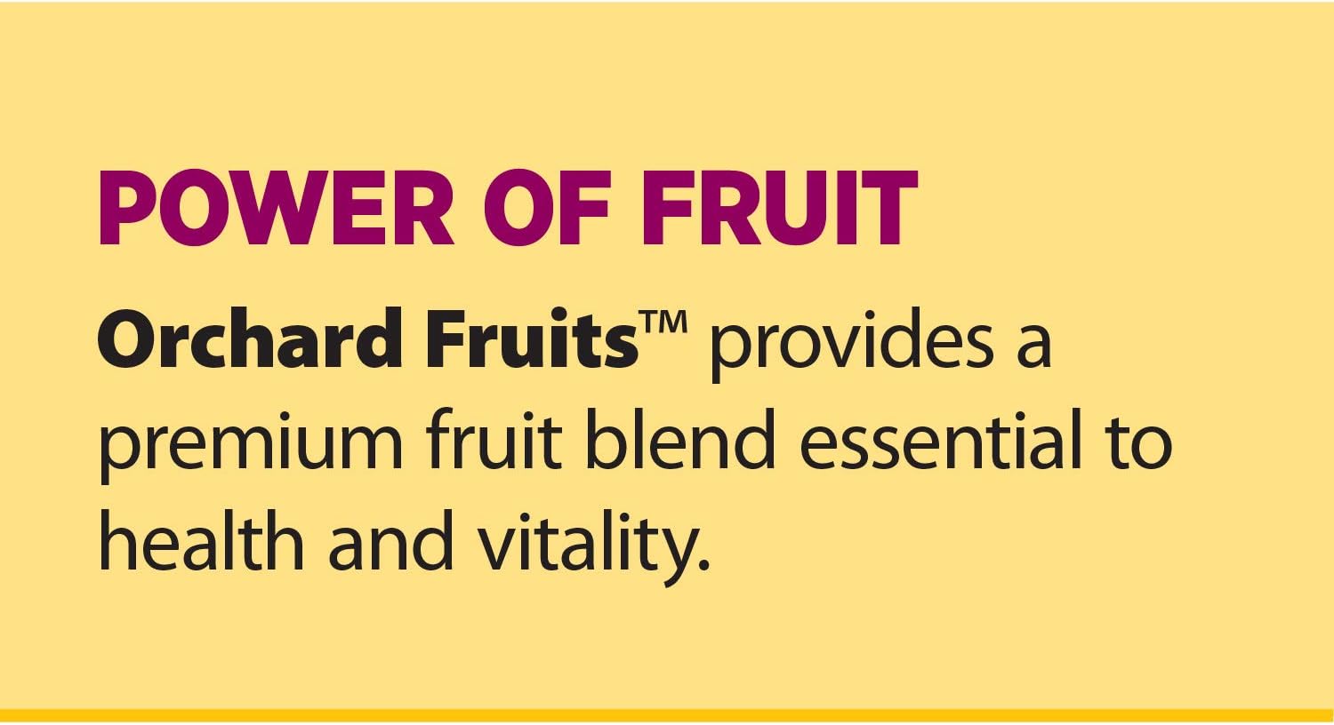 POWER OF FRUITOrchard Fruits provides a premium fruit blend essential to health and vitality.*This statement has not been evaluated by the Food and Drug Administration. This product is not intended to diagnose, treat, cure, or prevent any disease.