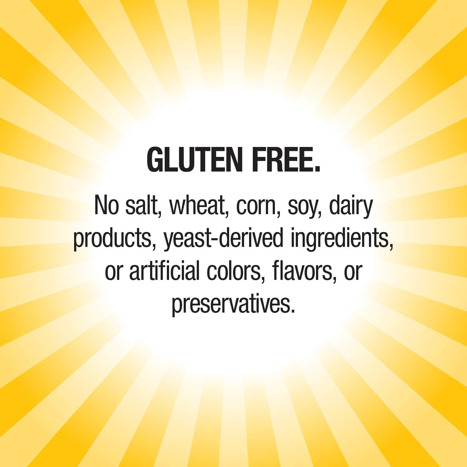 - Gluten-Free and Vegetarian. No salt, wheat, corn, soy, dairy products, yeast-derived ingredients, or artificial colors, flavors, or preservatives.