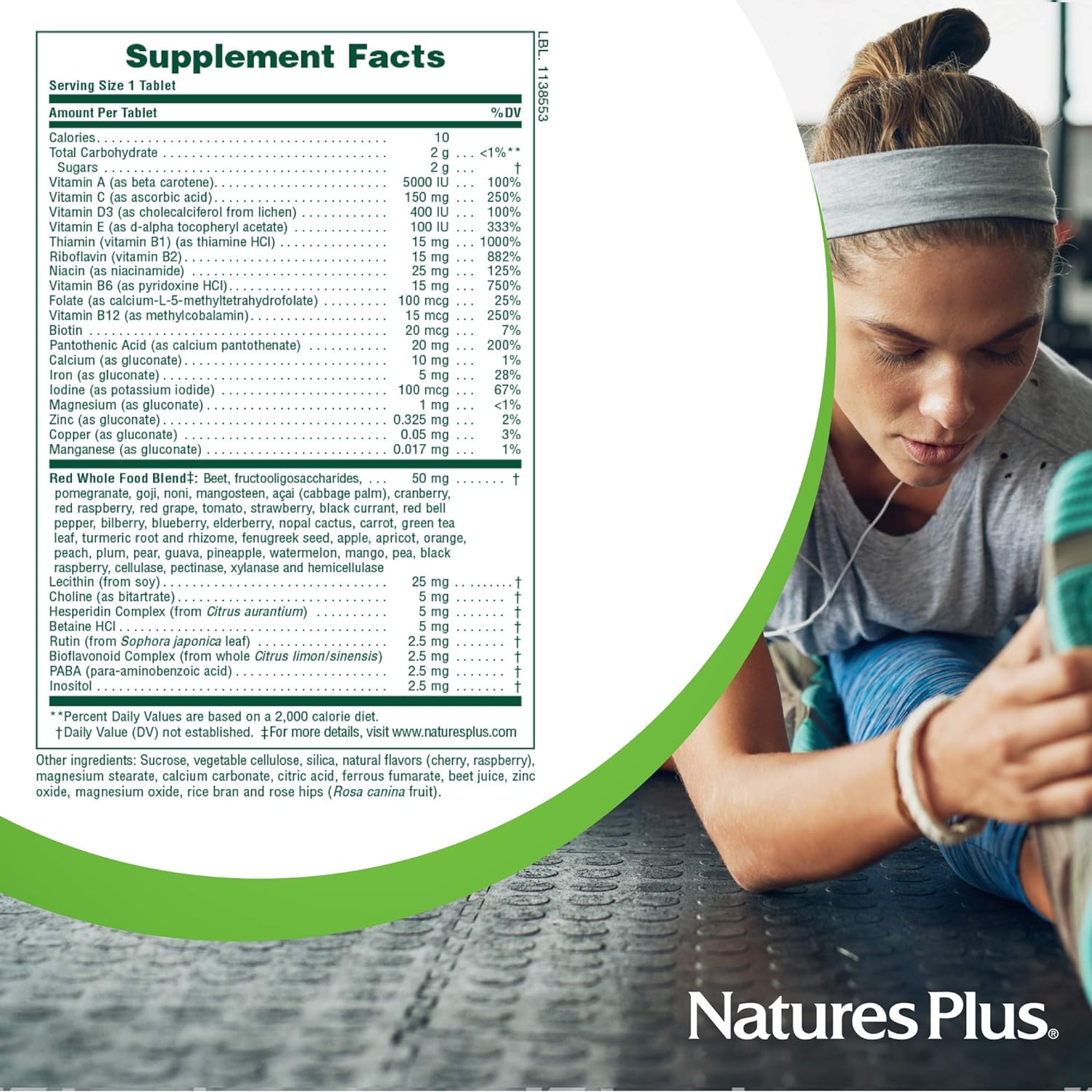 - EXOTIC RED SUPERFOODS SUPPLEMENT - Natures Plus Adult Multivitamin chewable contains 50 mg of whole red foods, boosting its antioxidant power and helping you to fight free radicals.