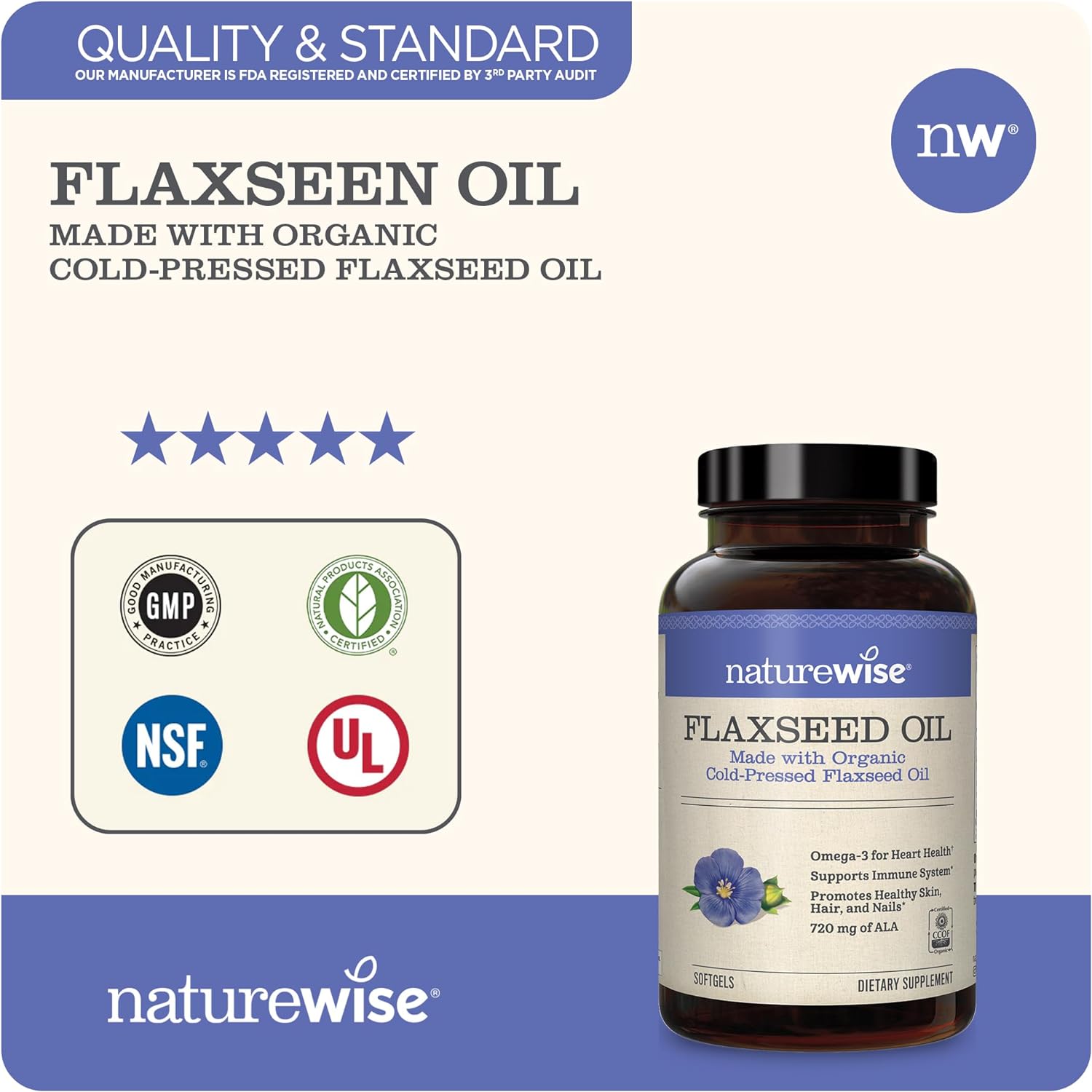 - HIGHEST POTENCY ALA: NatureWise Organic Flaxseed Oil delivers 720 mg ALA Omega-3 essential fatty acids per softgel, the highest concentration of ALA in any flaxseed oil supplements.