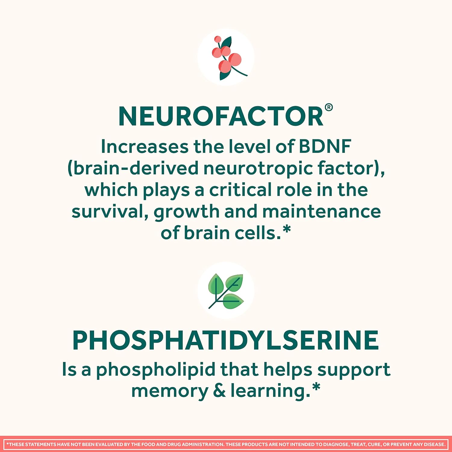 - BRAIN HEALTH SUPPORT: Clinically tested Neurofactor helps support focus, concentration and accuracy, while Plant-Sourced Phosphatidylserine helps fuel memory and learning.*