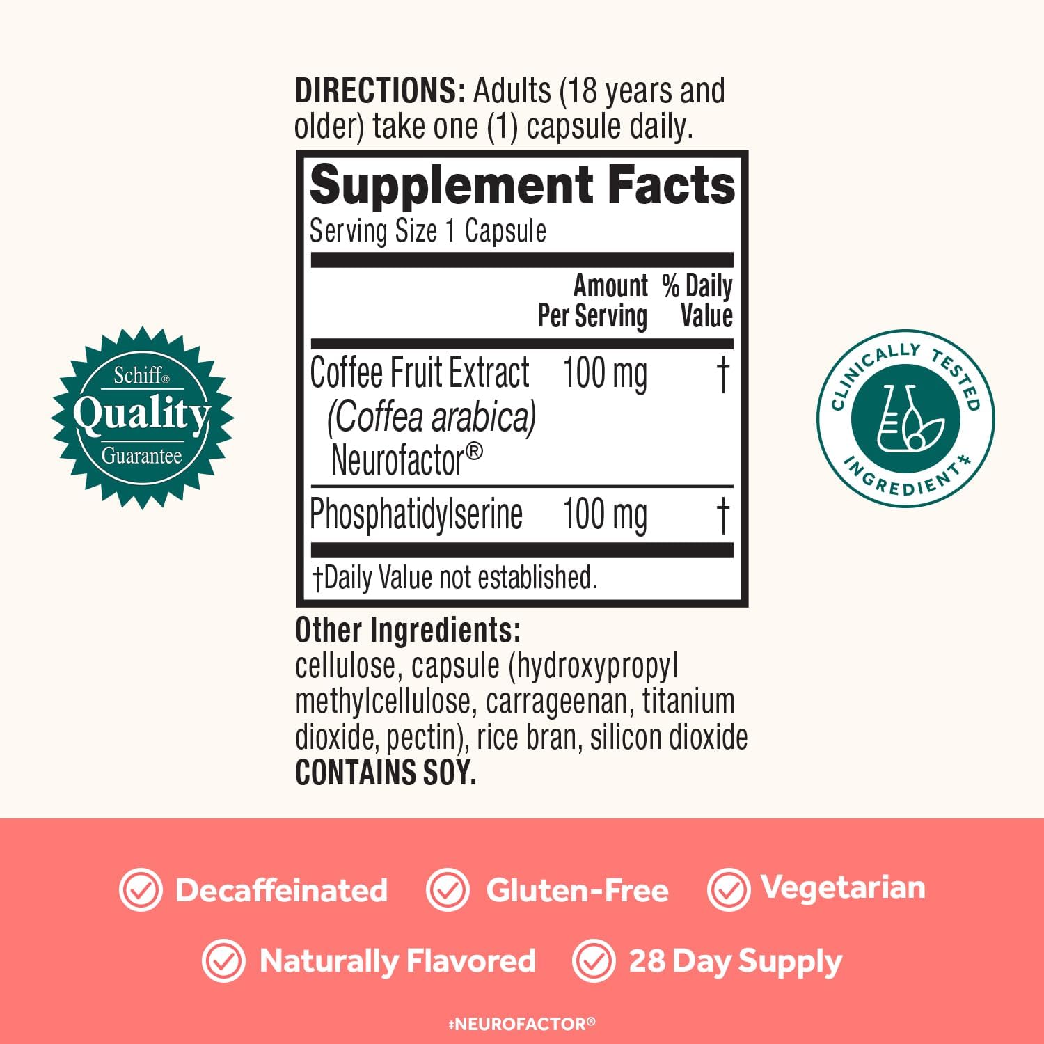 Coffee Fruit Extract (Coffea arabica), Phosphatidylserine, rice bran, capsule (hypromellose, carrageenan, titanium dioxide, pectin), microcrystalline cellulose, silicon dioxide. Contains Soy