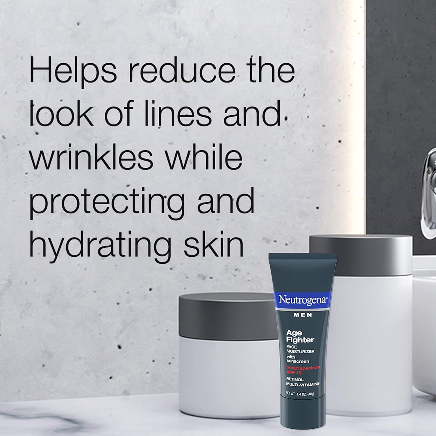 - 1.4-ounce bottle of Neutrogna Men Age Fighting Anti-Wrinkle Face Moisturizer for Men with Broad Spectrum Sunscreen SPF 15 to help reduce the look of lines and wrinkles while protecting and hydrating skin