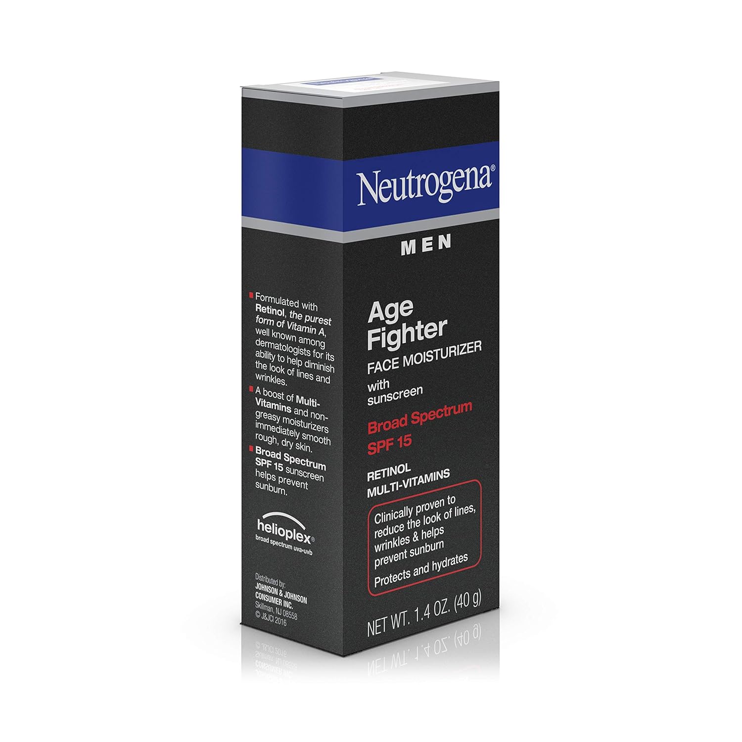 In one step, Neutrogena Men Age Fighter Anti-Wrinkle Retinol Face Moisturizer with Broad Spectrum Sunscreen SPF 15 helps reduce the look of lines and wrinkles while protecting and hydrating skin. This daily anti-aging moisturizer for men contains a boost of conditioning multi-vitamins and non-greasy moisturizers to help smooth rough, dry skin. It also contains Retinol, the purest form of vitamin A, which is well-known to help diminish the look of lines and wrinkles. This face lotion for men also contains Broad Spectrum SPF 15 sunscreen to help prevent against damage caused by the sun. The perfect addition to a daily men's skincare routine, use this facial moisturizer for an at-home self-care experience.