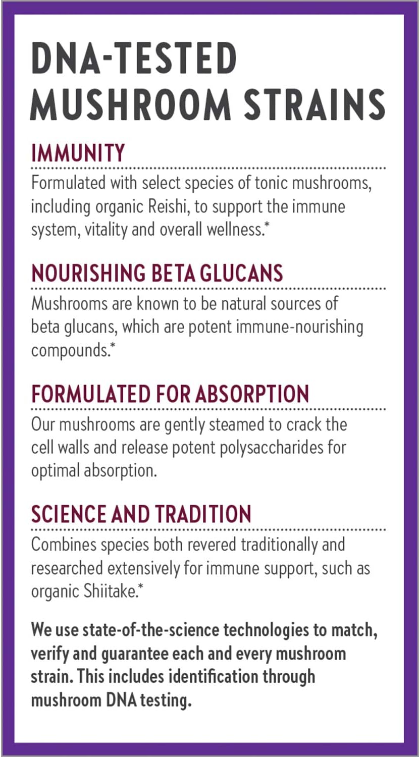 Mushrooms were once believed to be members of the plant kingdom. When closer inspection revealed that they also share similarities with animals, they were assigned their own kingdom—the Fungal Kingdom. Mushrooms must also adapt to their surroundings, and in doing so they produce a large array of protective compounds. Over thousands of years, people have discovered how consuming mushrooms can support health. The benefits of mushrooms include supporting a healthy immune system.* *These statements have not been evaluated by the Food and Drug Administration. This product is not intended to diagnose, treat, cure, or prevent any disease.