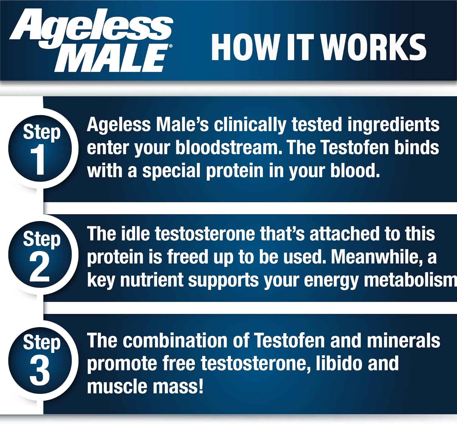 - STRENGTH, MUSCLE & ENERGY INCREASE: Ageless Male helps to boost lean muscle, muscle strength and endurance when combined with strength training. Ageless Male free testosterone booster for men will also help with healthy energy production!