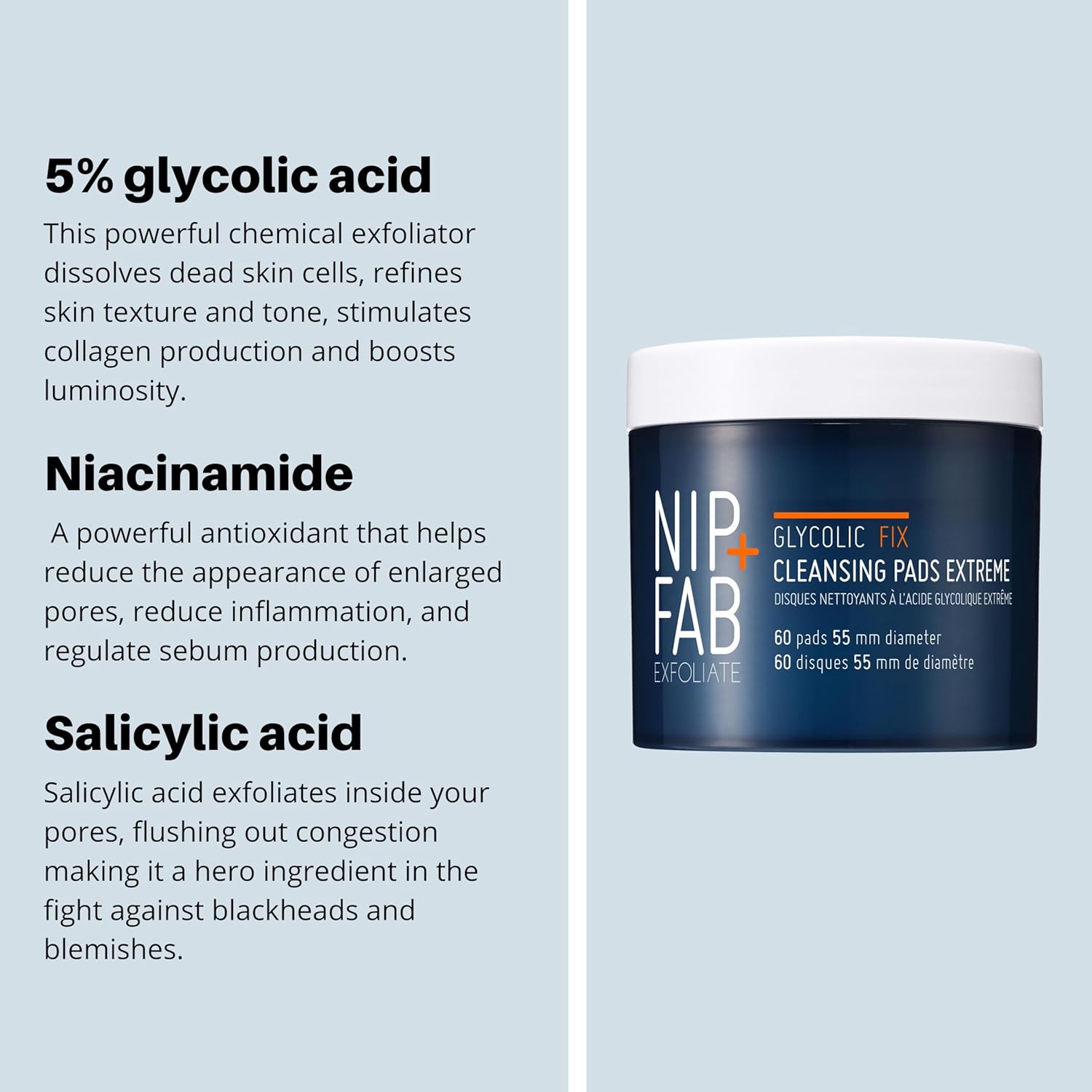 - GENTLY EXFOLIATES THE SKIN – Nip + Fab Glycolic Fix Night Face Pads work to gently exfoliate the skin. These exfoliating glycolic acid pads for face help with discoloration, acne scarring, and pigmentation.