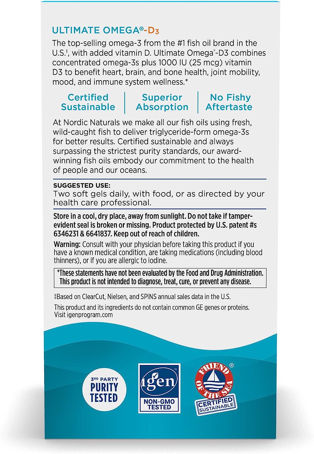 - DOCTOR-RECOMMENDED FORMULA - Nordic Naturals Ultimate Omega-D3 features high concentration omega-3 fish oil in soft gels. The added Vitamin D3 aids in calcium absorption & supports mood, joint & immune system health.