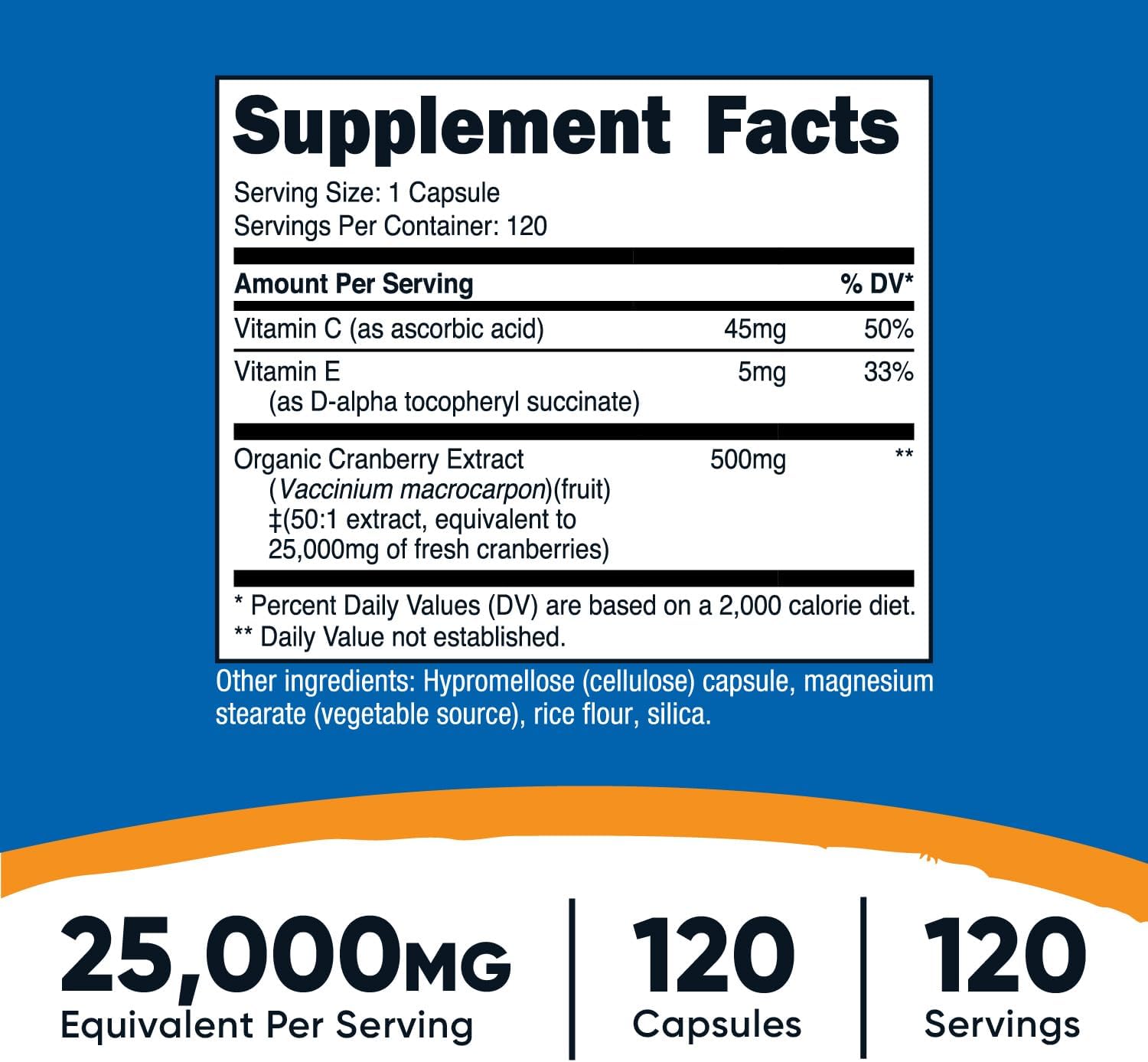 Vitamin C (as Ascorbic Acid), Vitamin E (as D-Alpha Tocopheryl Succinate), Cranberry Extract (Vaccinium Macrocarpon) (Fruit) (50:1 extract equivalent to 25,000mg of fresh cranberries), hypromellose (cellulose) capsule, magnesium stearate (vegetable source), rice flour, silica.