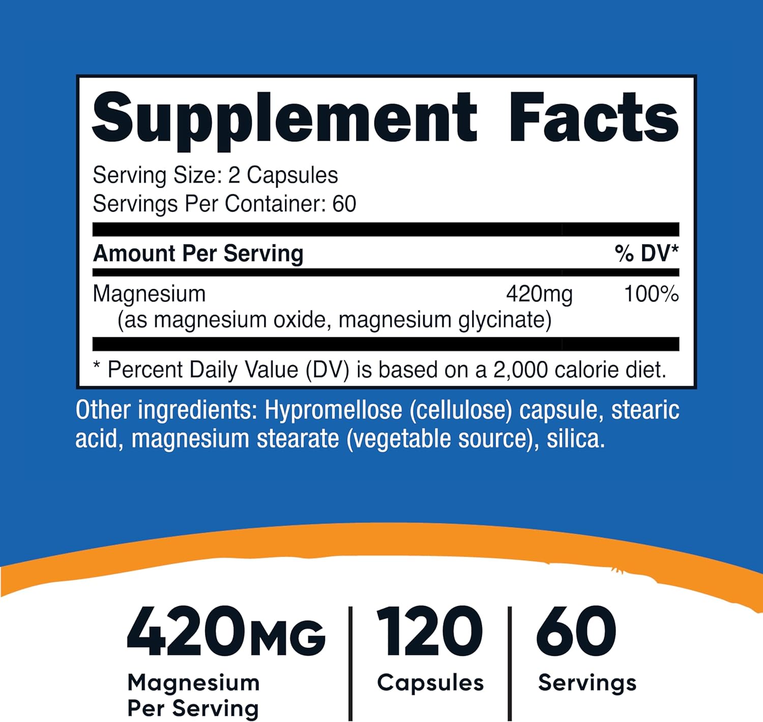 Nutricost Magnesium+ Extra Strength contains 420 milligrams of magnesium in every serving. 120 capsules for 60 servings per bottle. Extra Strength digestive support from magnesium glycinate and magnesium oxide.