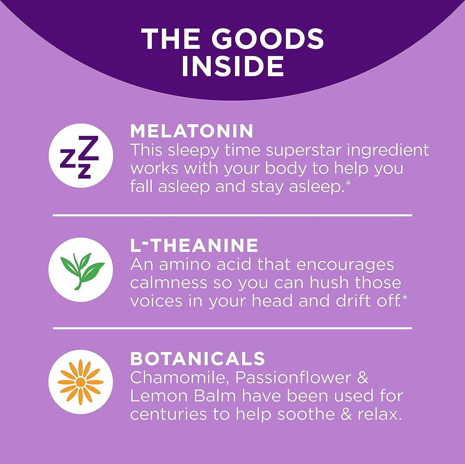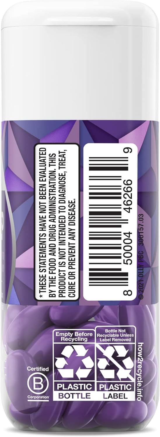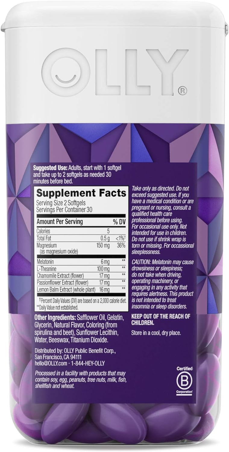 OLLY Ultra Strength Sleep Softgels boost your body's natural sleep hormone with a unique blend that helps calm your senses so you can relax and ZZZ.* A few highlights: This effective sleep blend features 10mg of Melatonin, a naturally occurring hormone that works with your body's chemistry plus magnesium to help to support relaxation in the muscles and nervous system.* L-Theanine is an amino acid that supports calmness and Botanicals like Chamomile, Passionflower & Lemon Balm have been used for centuries to help soothe and relax.* For a fresh twist, our premium OLLY sleep aid softgels have a hint of refreshing strawberry scent and zero sugar. Don’t let their size fool you—these little guys go big on results. Take up to 2 softgels as needed with water 30 minutes before bedtime as needed. Swallow whole, do not chew.* *These statements have not been evaluated by the Food and Drug Administration. DISCLAIMER: ‡Caution: Melatonin may cause drowsiness or sleepiness. Do not take while driving, operating machinery, or engaging in any activity that requires alertness. Take only as directed for occasional sleeplessness.