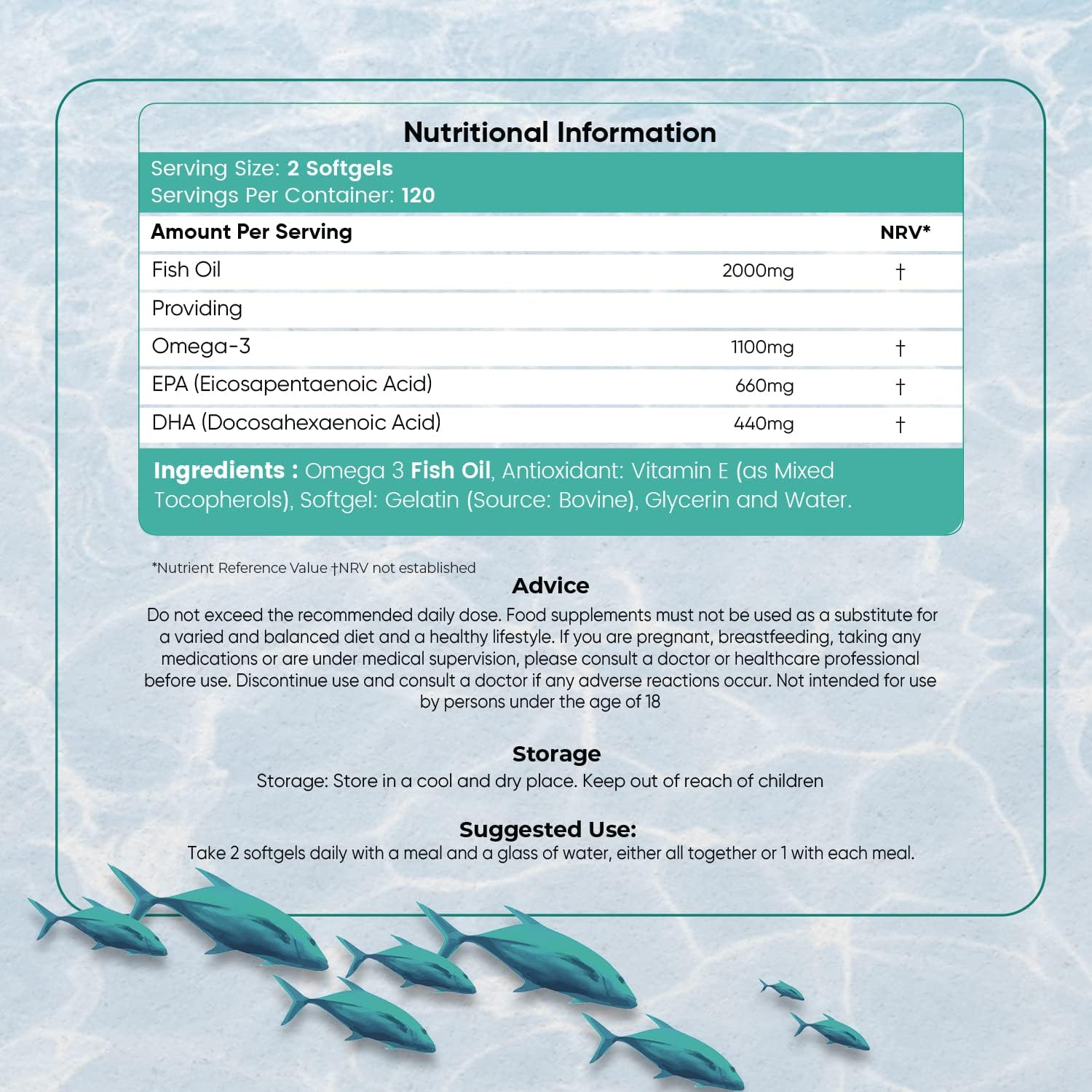 - NO FISHY AFTERTASTE OR BURPS: Our Omega 3 2000mg capsules are specially developed to be gentle on the stomach & easy to swallow. Best of all, our omega 3 supplements for adults are highly concentrated to offer you top-quality fish oil with no reflux, fishy burps or aftertaste. Each bottle has 240 omega 3 fish oil capsules to keep you replenished for 4 months. Our EPA DHA capsules are ideal for everyone including young adults, senior citizens, athletes, working professionals, etc.