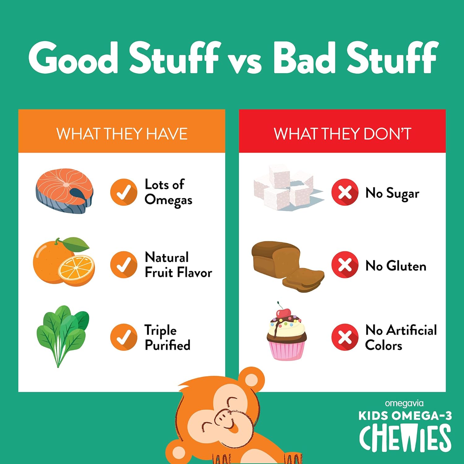 - Mighty Omega 3 for Kids - Power up your young adventurers from the inside out! OmegaVia Kids Omega 3 fish oil gummies pack a whopping 400mg of DHA Omega-3 into one delicious sugar-free chewie, 10x higher than leading omega 3 gummy or vitamin*