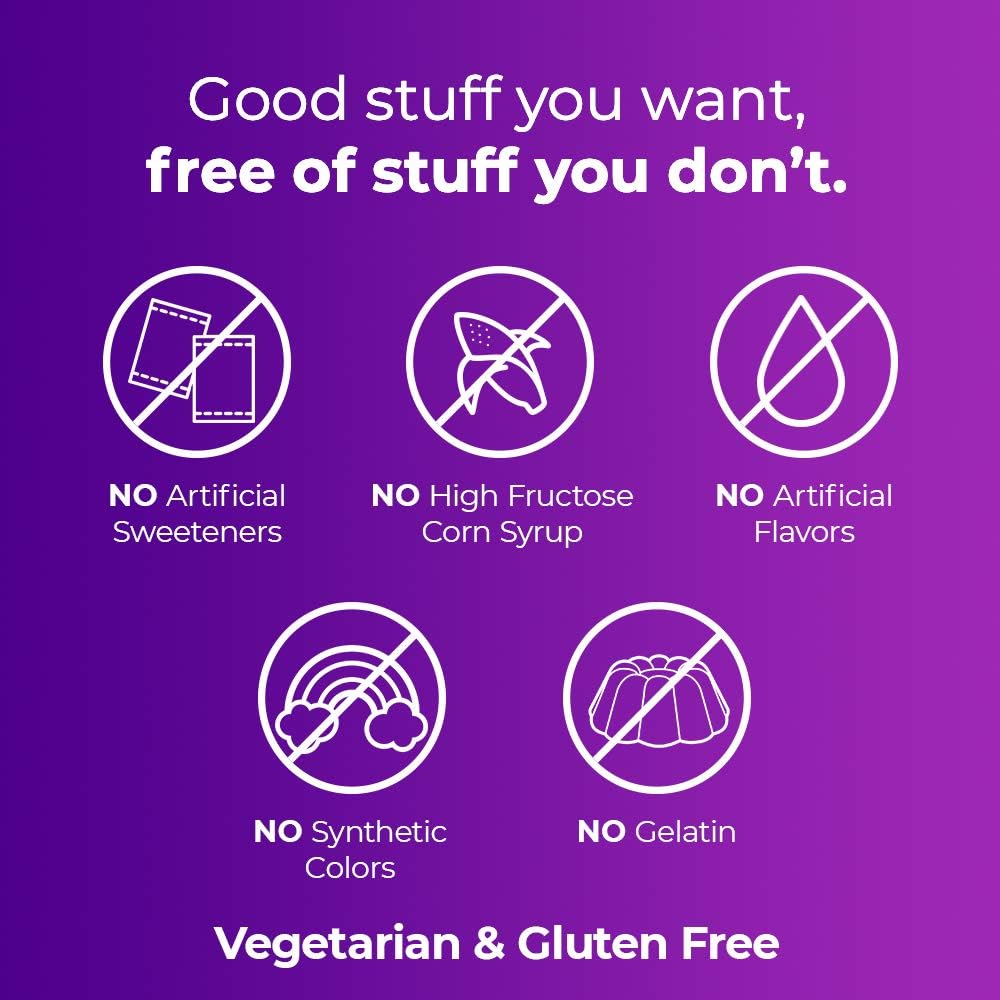 - No high fructose corn syrup, artificial colors or flavors, synthetic colors, gelatin, or palm oil