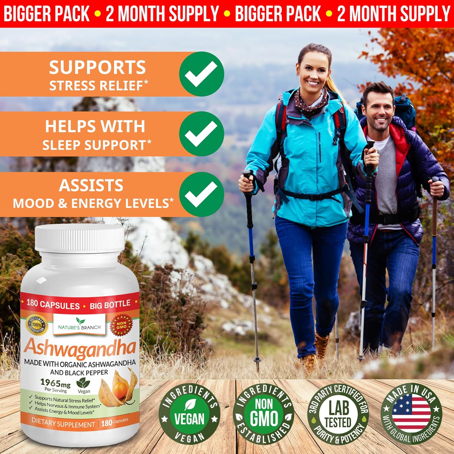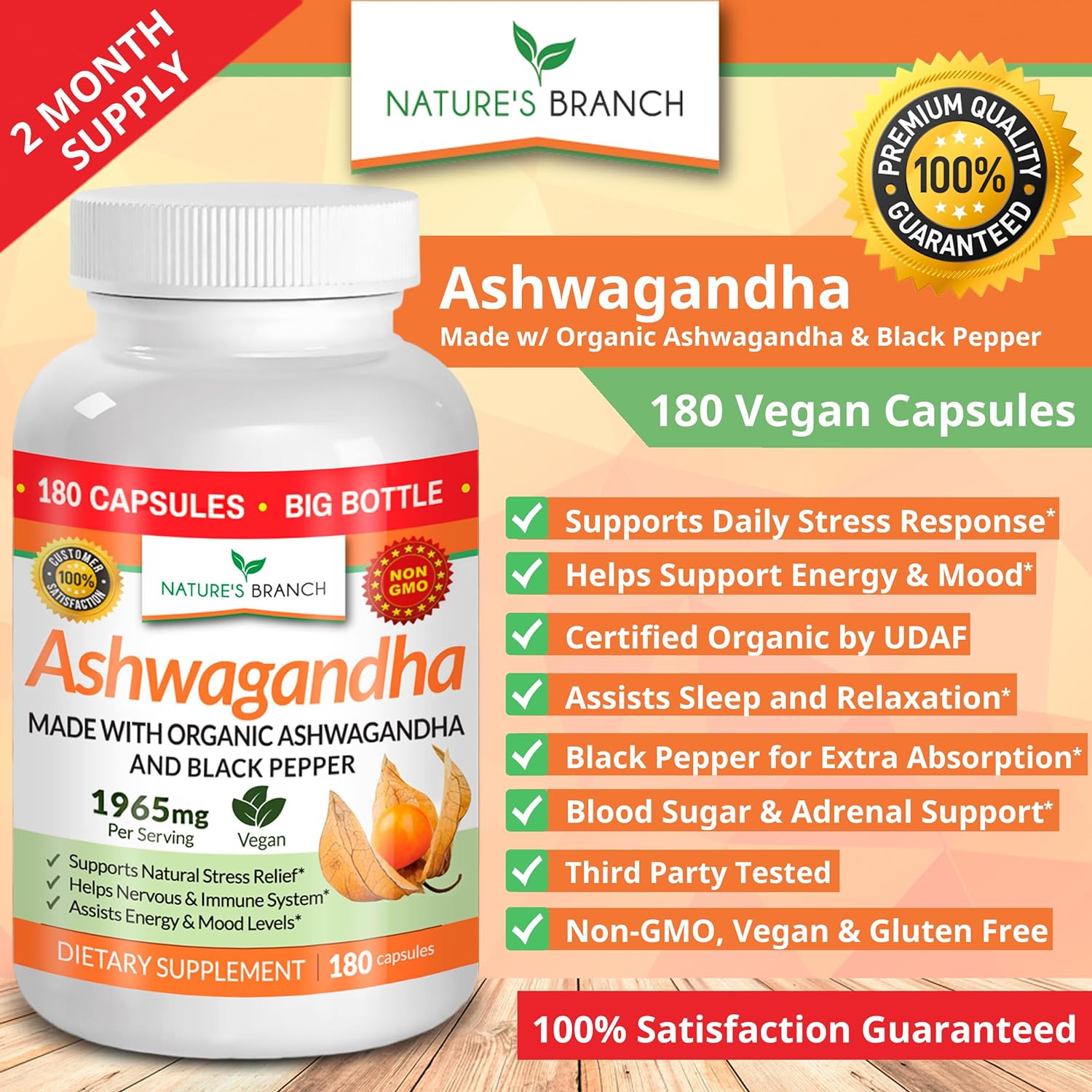 - ✅ ALL NATURAL & MADE IN THE USA Nature’s Branch Ashwagandha supplements contain globally sourced ashwagandha root powder with black pepper for the best ashwagandha experience – THIRD PARTY TESTED & GMP CERTIFIED for QUALITY, POTENCY & PURITY.* Our ashwagandha capsules are completely free from artificial ingredients and preservatives for a 100% NON GMO gluten free choice. Enjoy our ashwagandha pills at the BEST VALUE!