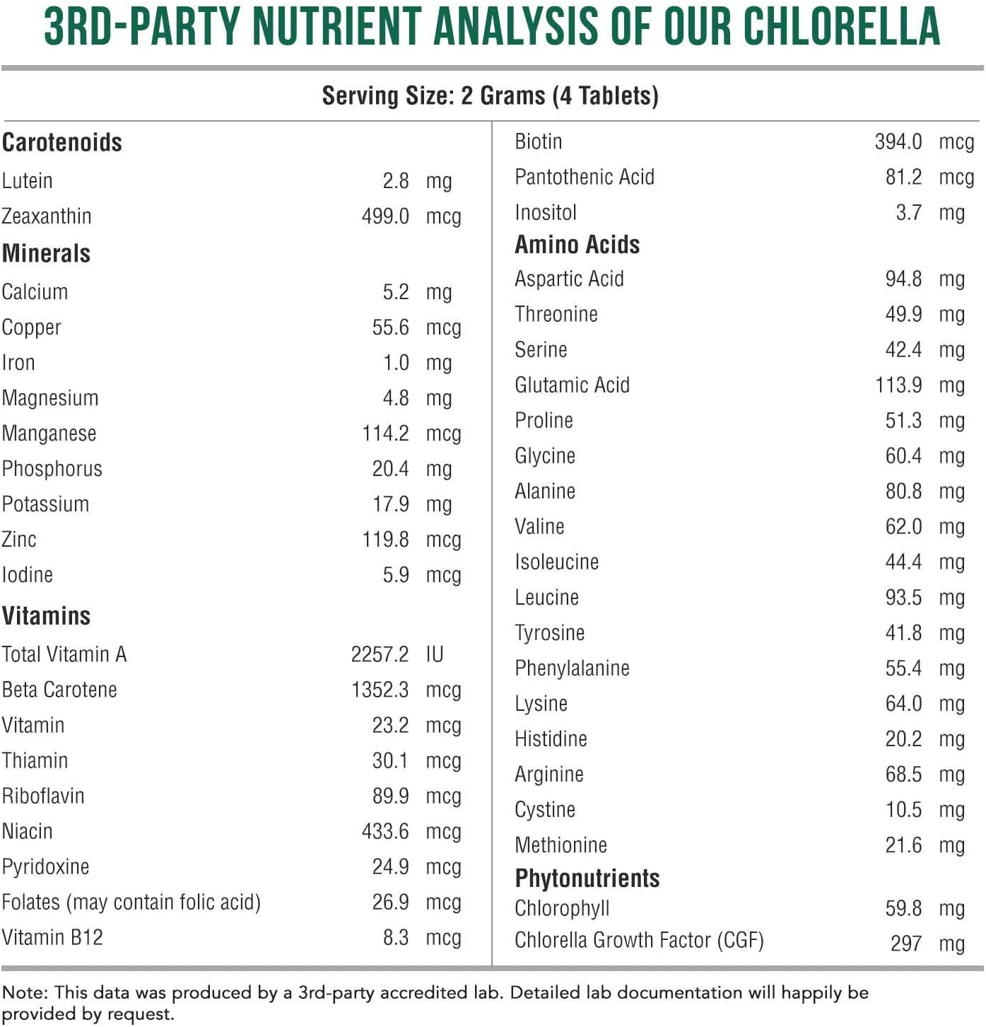 Third-Party Tested, 100% Contaminate Free: Organic BioChlorella Chlorella is grown in an environmentally pristine region of South India with plentiful sunlight, 100% purified-water, and plant-based fertilizers--employing the world's most rigid organic and quality standards. It is also third-party tested for heavy metals, mold, E. coli, BMAA, microcystins, pheophorbide, irradiation, chemical treatment, GMOs, solvents, binders, soy, and gelatin.