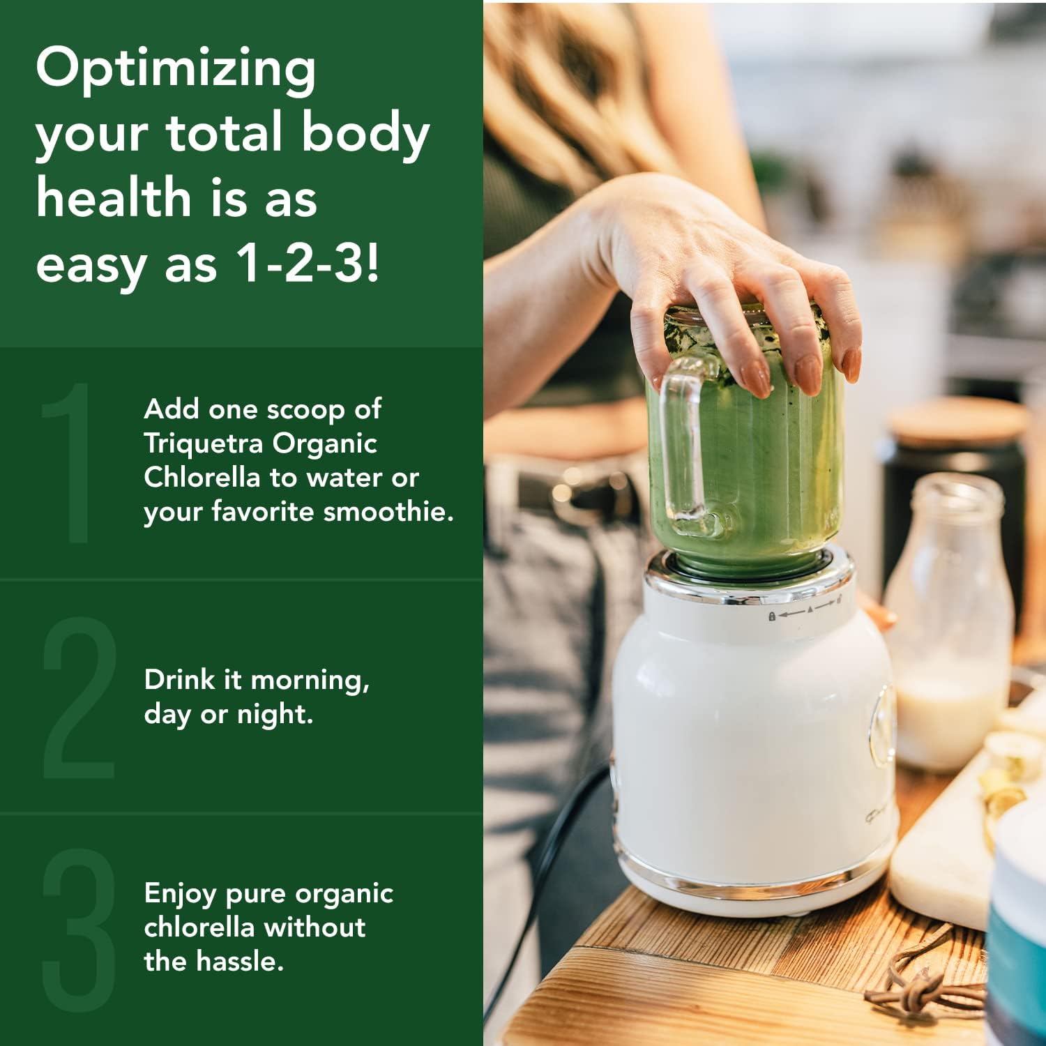 - Promotes Total Body Health at the Cellular Level: Extensive studies have shown that chlorella can support brain health, cardiovascular health, blood & cell health, skin health & appearance, healthy immune functions, and alkalization & detox of the body. It also restores and optimizes cellular health by neutralizing oxidative stress and inflammation.