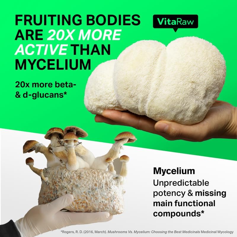 - 50% More Active than Mycelium: We only use real mushroom fruiting bodies. Many lion’s mane “mushroom” supplements aren’t mushrooms: They are roots (mycelium). As these roots are grown on grains, you end up with up to 50% grain in your “mushroom” powder capsule when choosing alternatives.