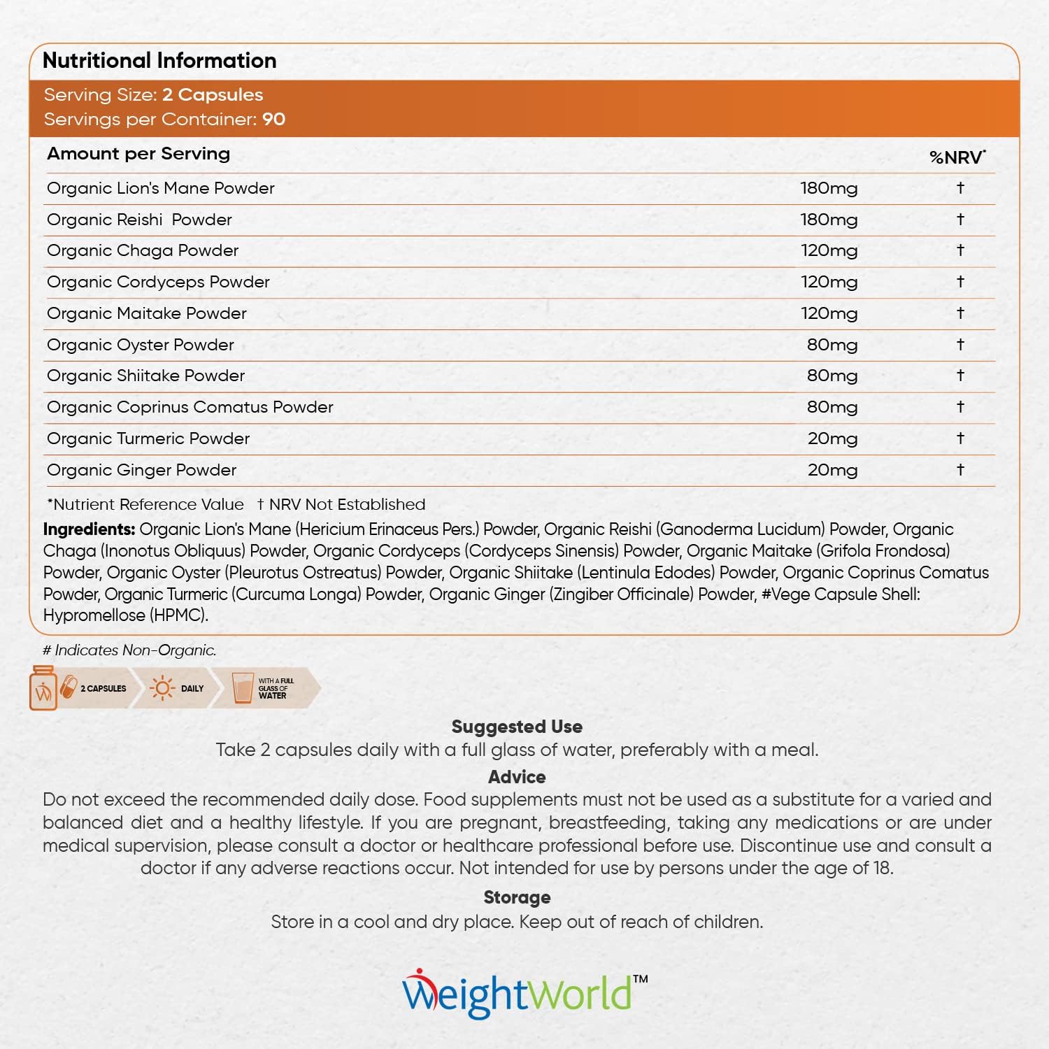 - WEIGHTWORLD'S ORGANIC MUSHROOM COMPLEX CAPSULES 8: Looking for the perfect mushroom supplement? Look no further than our Organic Mushroom Complex 8 Capsules. We proudly present a blend of 8 organic mushroom powders, like cordyceps, lion's mane extract, reishi, chaga mushroom, shiitake, maitake, oyster, & coprius mushrooms. Why settle for single mushroom supplements like Lion's Mane extract or Reishi capsules when you can enjoy the benefits of this mushroom powder blend in one capsule?