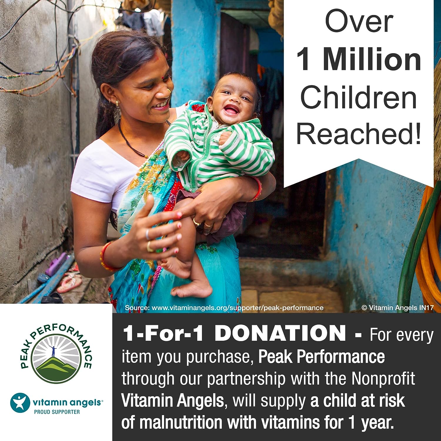 Over 500,000 Happy Customers + 1-for-1 Donation To Vitamin Angels. Peak Performance is celebrating over 500,000 happy customers and we are also very proud of our 1-for-1 donation match program. For every unit you purchase, through our partnership with the nonprofit Vitamin Angels, we will supply a child at risk of malnutrition with vitamins for 1 year! To date, we've supplied over 1 Million children with life changing Vitamins- So thank you for helping us continue this great cause!