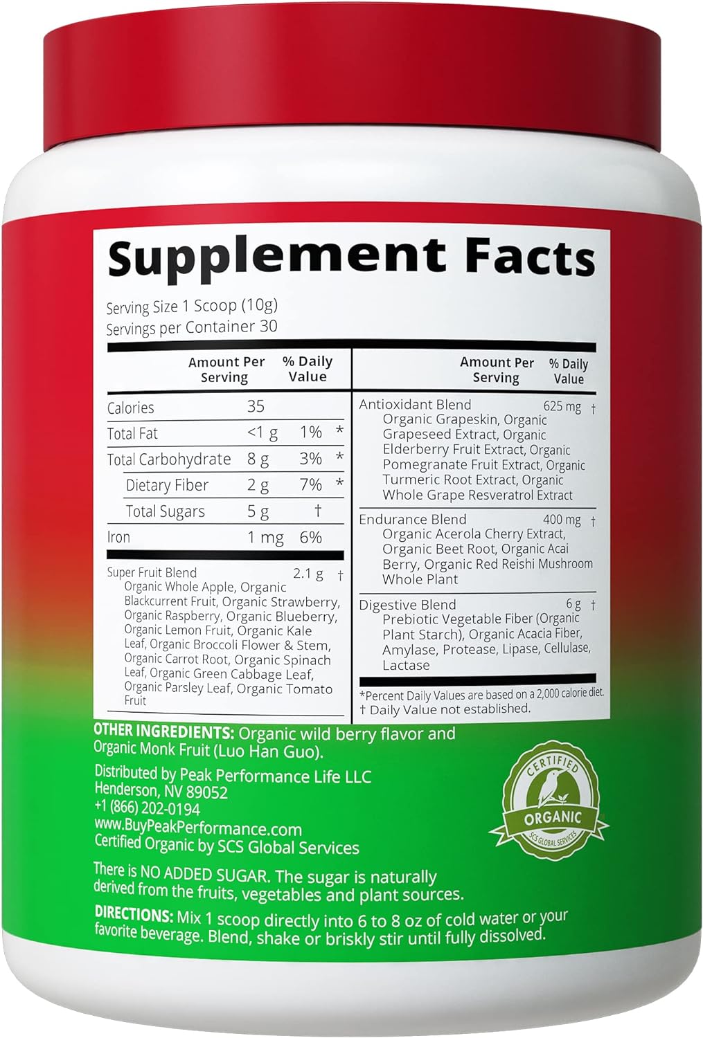 Super Fruit Blend: Organic Apple, Organic Blackcurrant, Organic Strawberry, Organic Raspberry, Organic Blueberry, Organic Lemon, Organic Kale, Organic Broccoli, Organic Carrot, Organic Spinach, Organic Green Cabbage, Organic Parsley, Organic Tomato<p> Antioxidant Blend: Organic Grapeskin, Organic Grapeseed, Organic Elderberry, Organic Pomegranate Extract, Organic Turmeric, Organic Whole Grape Resveratrol Extract<p> Endurance Blend: Organic Acerola Cherry Extract, Organic Beet (Root), Organic Acai Berry, Organic Red Reishi Mushroom.<p> Digestive Blend: Prebiotic Vegetable Fiber (Organic Tapioca Starch), Organic Acacia Fiber, Digestive Enzyme Blend (Amylase, Protease, Lipase, Cellulase, Lactase)<p>