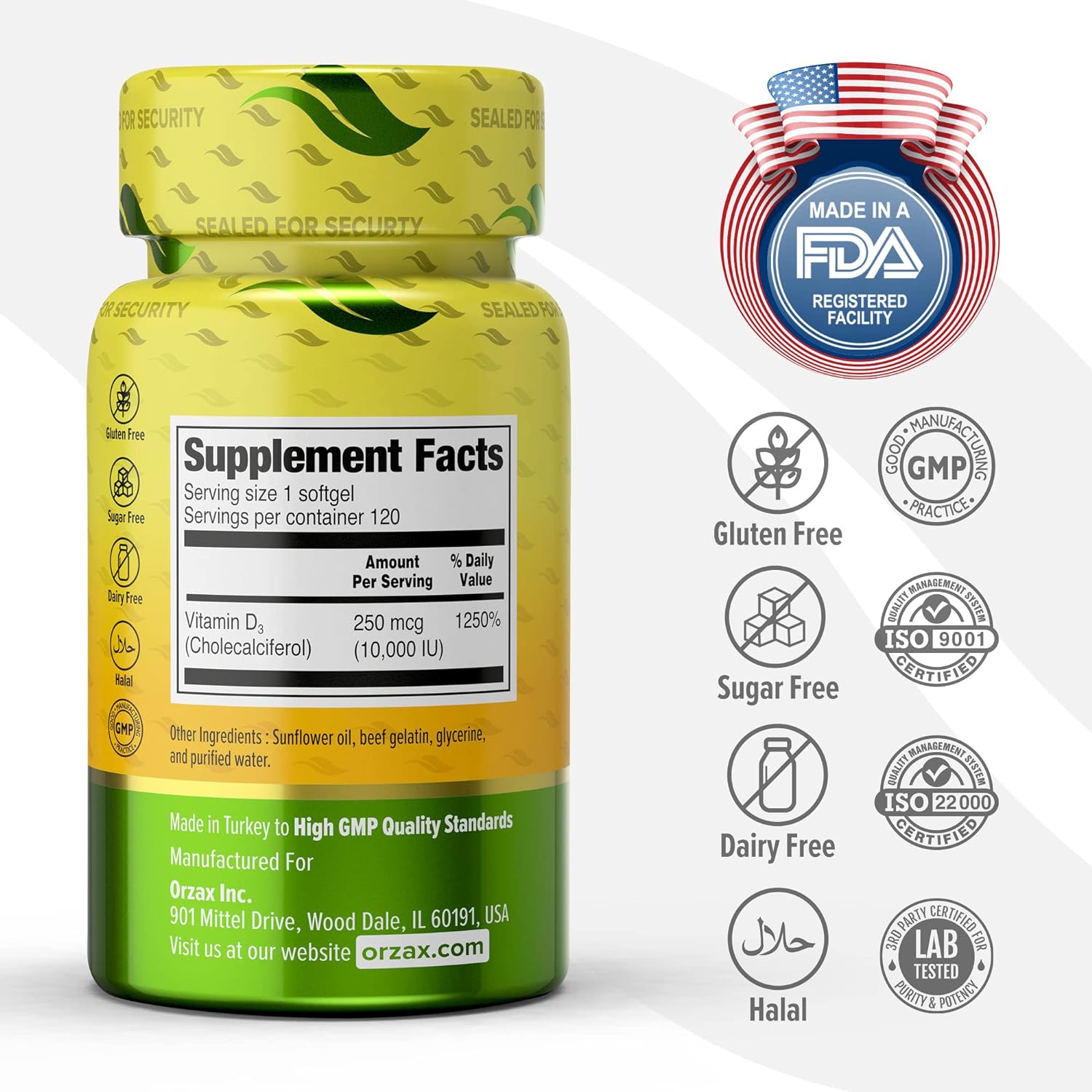 - Mood Regulation: Vitamin D is essential for the supporting daily mood. Orzax Vitamin D3 provides 10000 iu per softgels that helps support vitamin D3 levels for regulating the mental system.