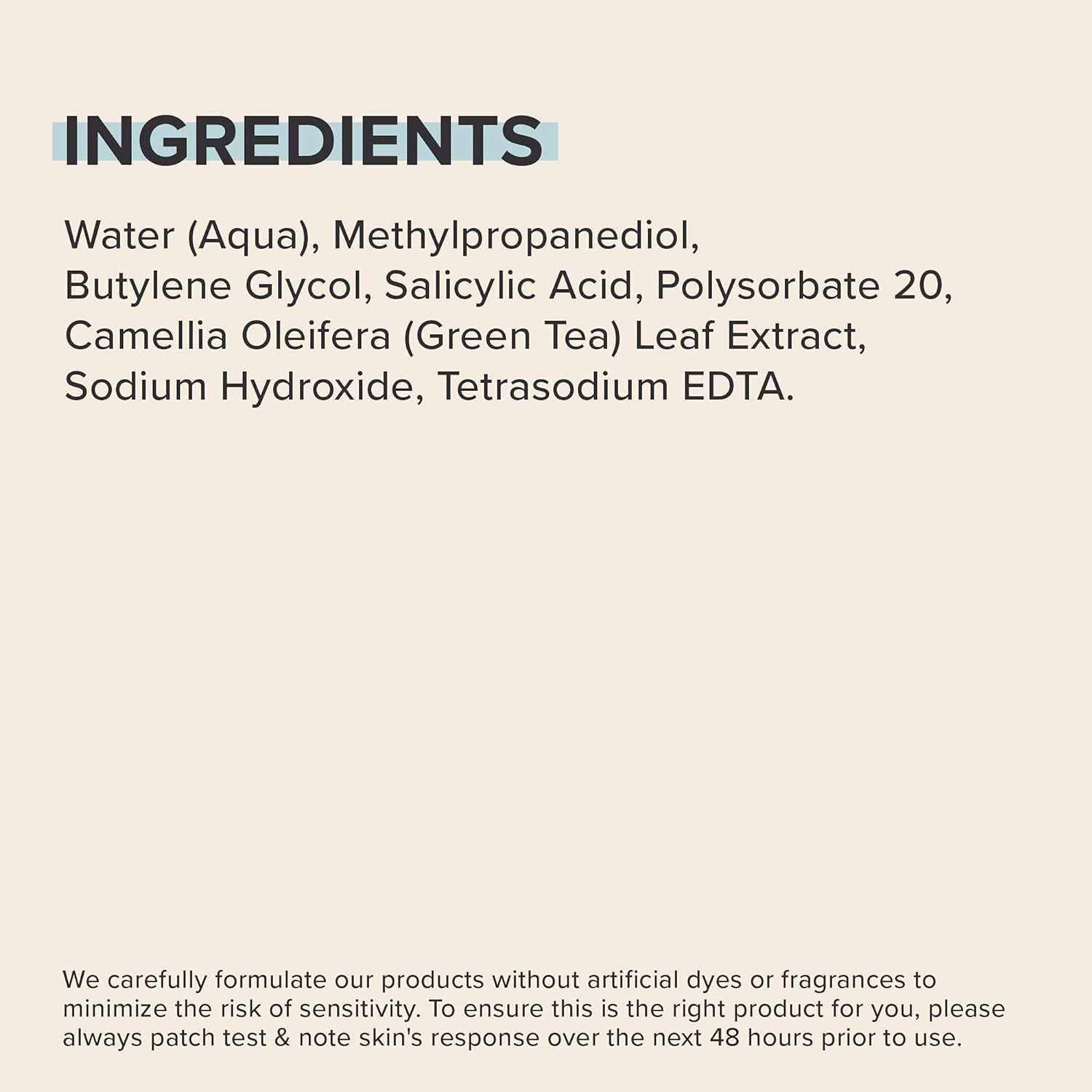 Water (Aqua), Methylpropanediol, Butylene Glycol, Salicylic Acid, Polysorbate 20, Camellia Oleifera (Green Tea) Leaf Extract, Sodium Hydroxide, Tetrasodium EDTA