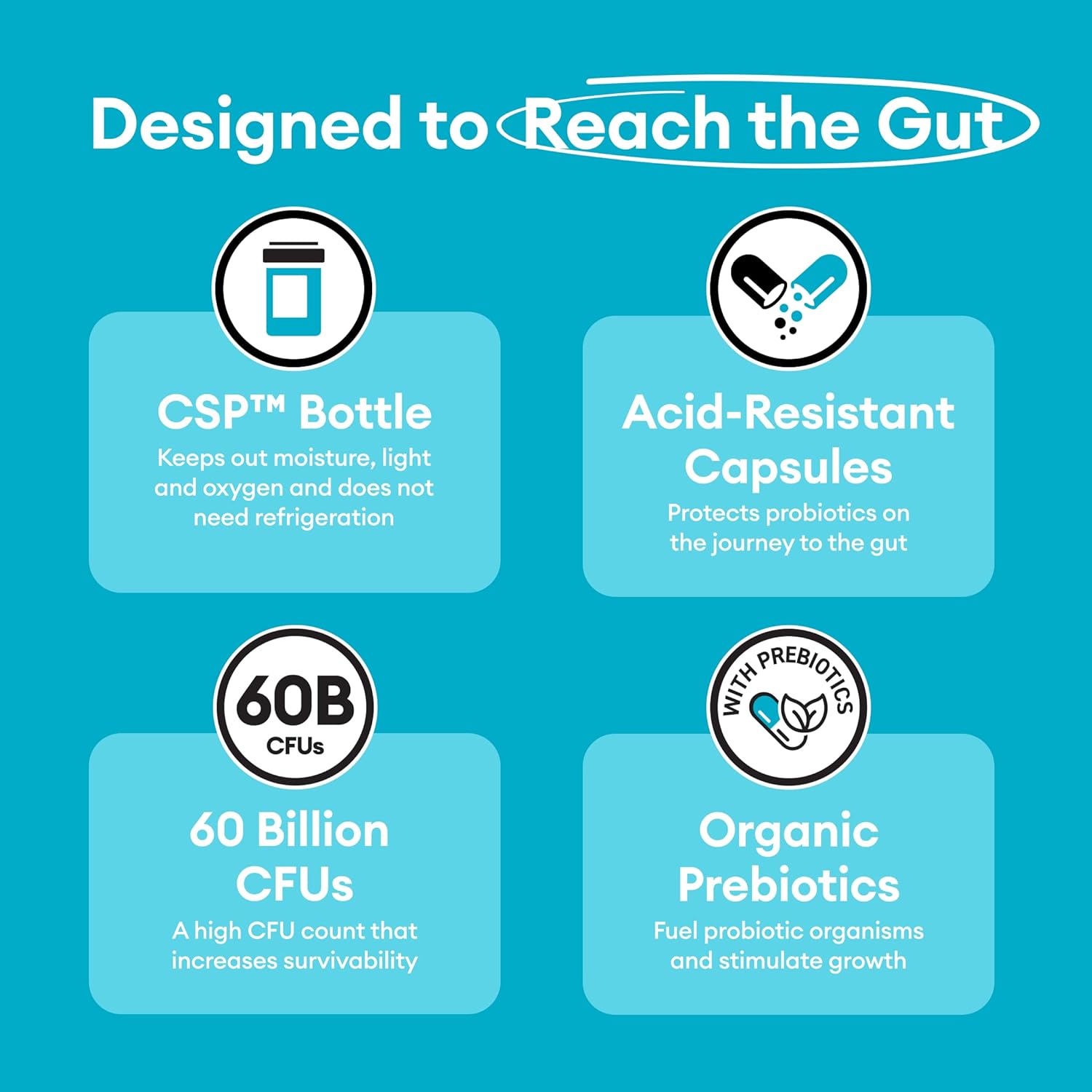- Survives the Gut: From start to finish - this probiotic is designed to survive the gut & maximize the colonization of our strains. We use a shelf-stable bottle, acid-resistant capsules, and 60 Billion Colony forming units (CFU) to achieve this!