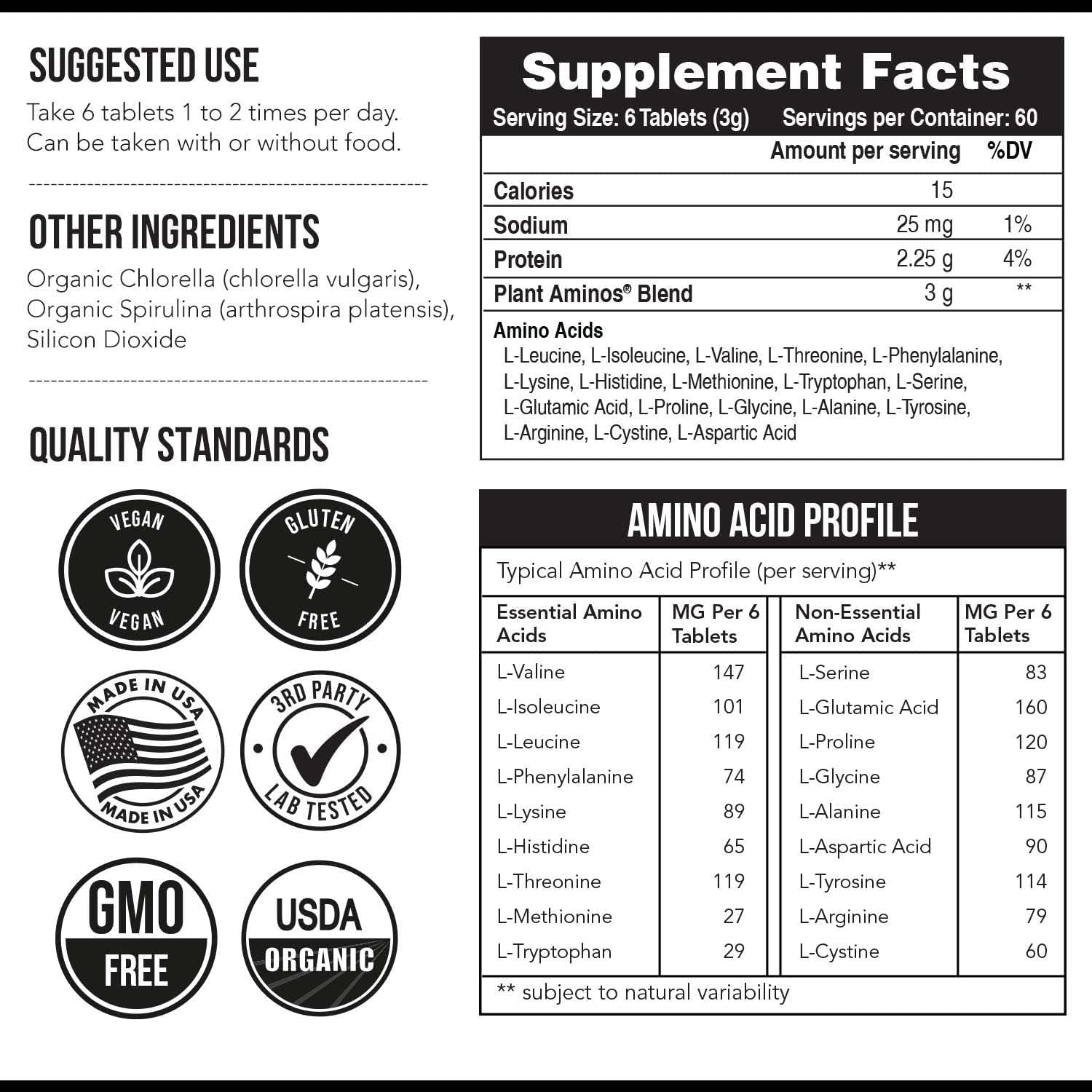 - 100% Organic Plant-based Essential Amino Acids: Plant Aminos are 100% organic plant-based essential amino acids. All of the amino acids are delivered naturally in raw whole-food form by combining the most amino acid dense forms of Organic Spirulina & Organic Chlorella. They are shown to have 4x higher absorption than Whey or Soy-based amino acids.
