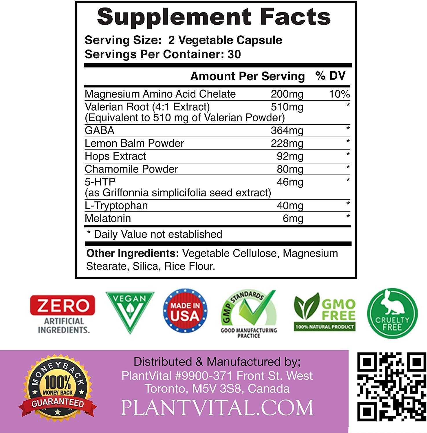 Valerian Root (Valeriana officinalis) Magnesium (as Magnesium Oxide) Tryptophan (as L-Tryptophan) Lemon Balm Extract (Melissa officinalis) Hops Flower Extract (Humulus lupulus)(flower) Gamma Aminobutyric Acid (GABA) Chamomile Flower Powder (Matricaria chamomilla) 5-HTP (as Griffonnia simplicifolia seed extract), Melatonin