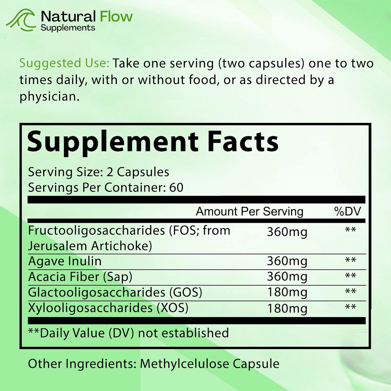 - LEVEL UP YOUR FIBER SUPPLEMENT : Each serving(two caps) of this unique prebiotic fiber blend contains XOS, GOS, FOS(from Jerusalem Artichoke), Acacia Fiber(Sap), and Inulin(Agave). Does your fiber supplement offer diverse forms like these?
