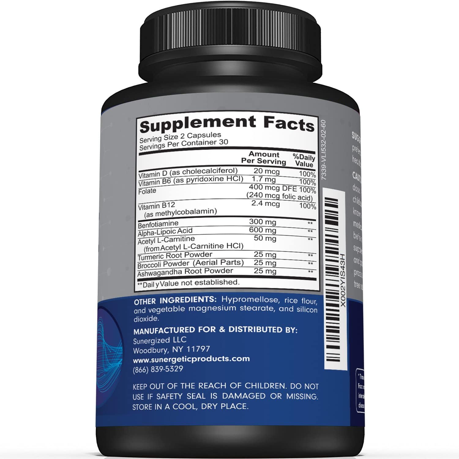 - 600 MG OF ALPHA LIPOIC AICD: No other nerve supplements include our precise powerful blend of nerve supporting ingredients. Just two small capsules include 600 mg of Alpha-Lipoic Acid, Acetyl-L-Carnitine, Benfotiamine (Vitamin B1), Turmeric, Broccoli, Ashwagandha, Vitamin B6, Folate, Vitamin D and Vitamin B12. We use Alpha Lipoic Acid 600 mg because it’s the same dose used in clinical studies. Feel the power of our advanced Nerve Support Supplement today!