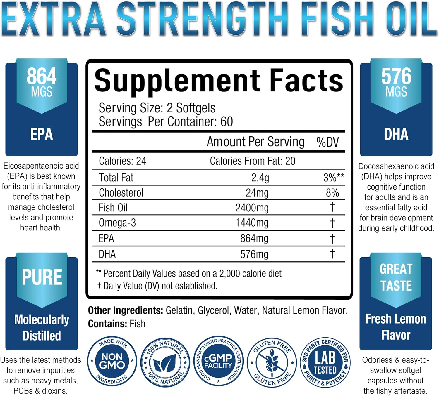 Premium Omega 3 Fish Oil Supplement 2400mg -120 Softgels
