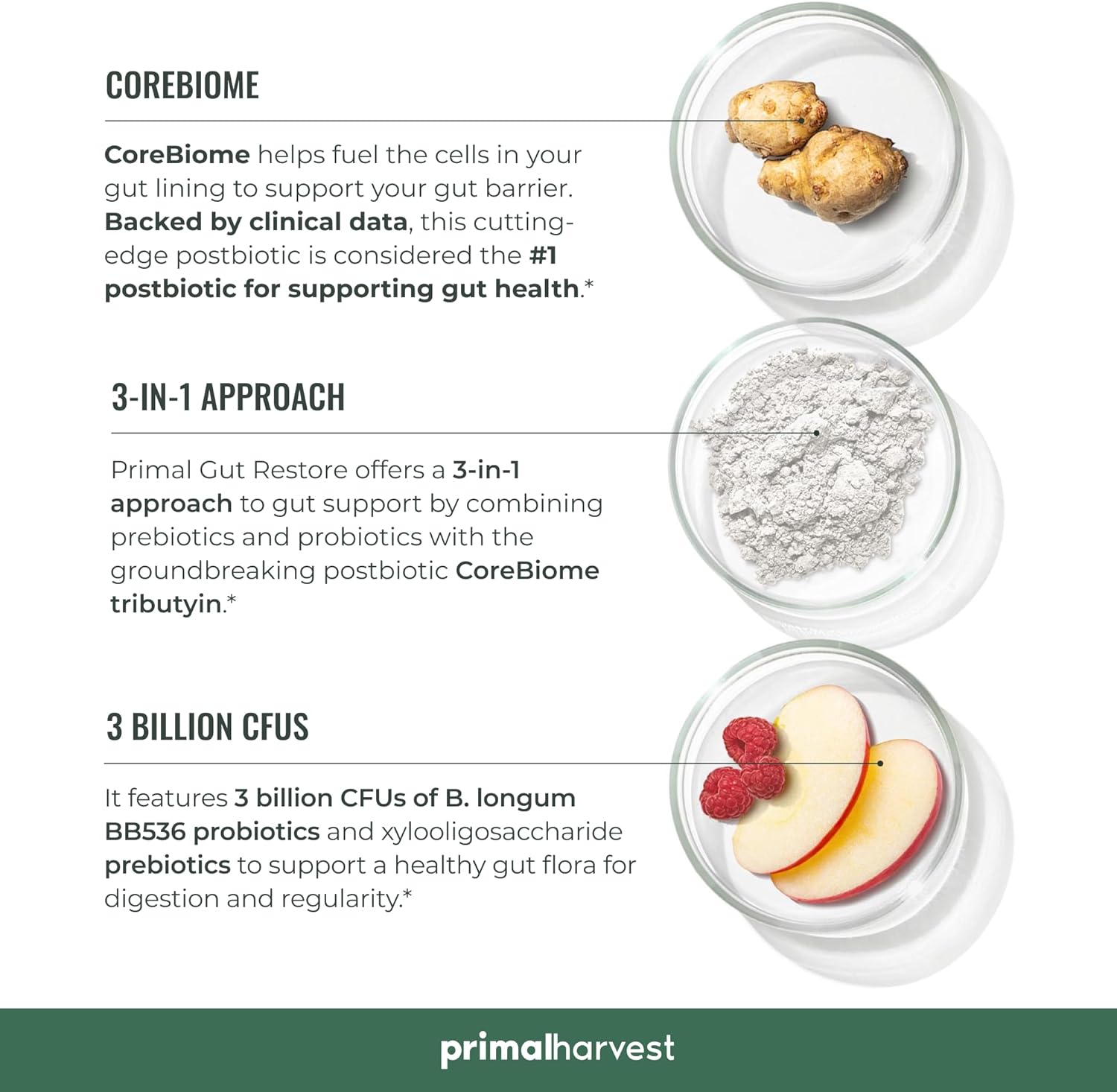 - A complete synbiotic supplement: Gut Restore is a powerful three-tier approach to support essential digestive enzymes with probiotics and prebiotics. Featuring fast-acting, cutting-edge patented technology, this complete package uses the power of prebiotics and probiotics, optimized by breakthrough CoreBiome Tributyrin postbiotics to help strengthen your gut lining, restore balance, and rev up your digestive health long-term.