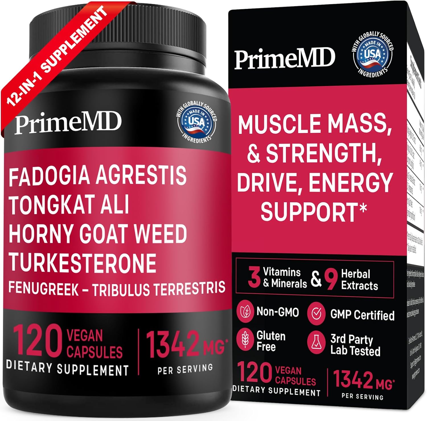 Bust your workout plateaus, perform at your peak, and experience physical performance like no other. Introducing PrimeMD 12-in-1 Fadogia Agrestis & Tongkat Ali Mens Testosterone Support and Male Health Support. This powerful muscle builder for men supplement works to provide your body with the energy you need to finish strong every set, every rep, and every gym day. Unlike other natural testosterone support for men, testerone supplement, tonga ali, and tongkat ali fadogia agrestis, ours contain a synergy of 3 vitamins and minerals, and 9 herbal extracts that work together to support consistent energy, and the kind of stamina that lets you keep going, whether you're in the gym or somewhere else.. Feel and think like a champ with the help of Tongkat Ali and Turkesterone, which are both known to promote balanced cortisol levels for regulating stress responses. With a blend like ours, you'll build muscle faster and fight off post-workout burnout to go even harder the next day. Turkesterone, Tribulus Terrestris, and Maca root also support overall physical performance, body composition, and muscle aesthetics. Why take multiple supplements for energy and testosterone levels if you can get everything you need for hormone balance and male health in one serving? Try PrimeMD's 12-in-1 Fadogia Agrestis & Tongkat Ali Muscle Testosterone Support Supplement Today!