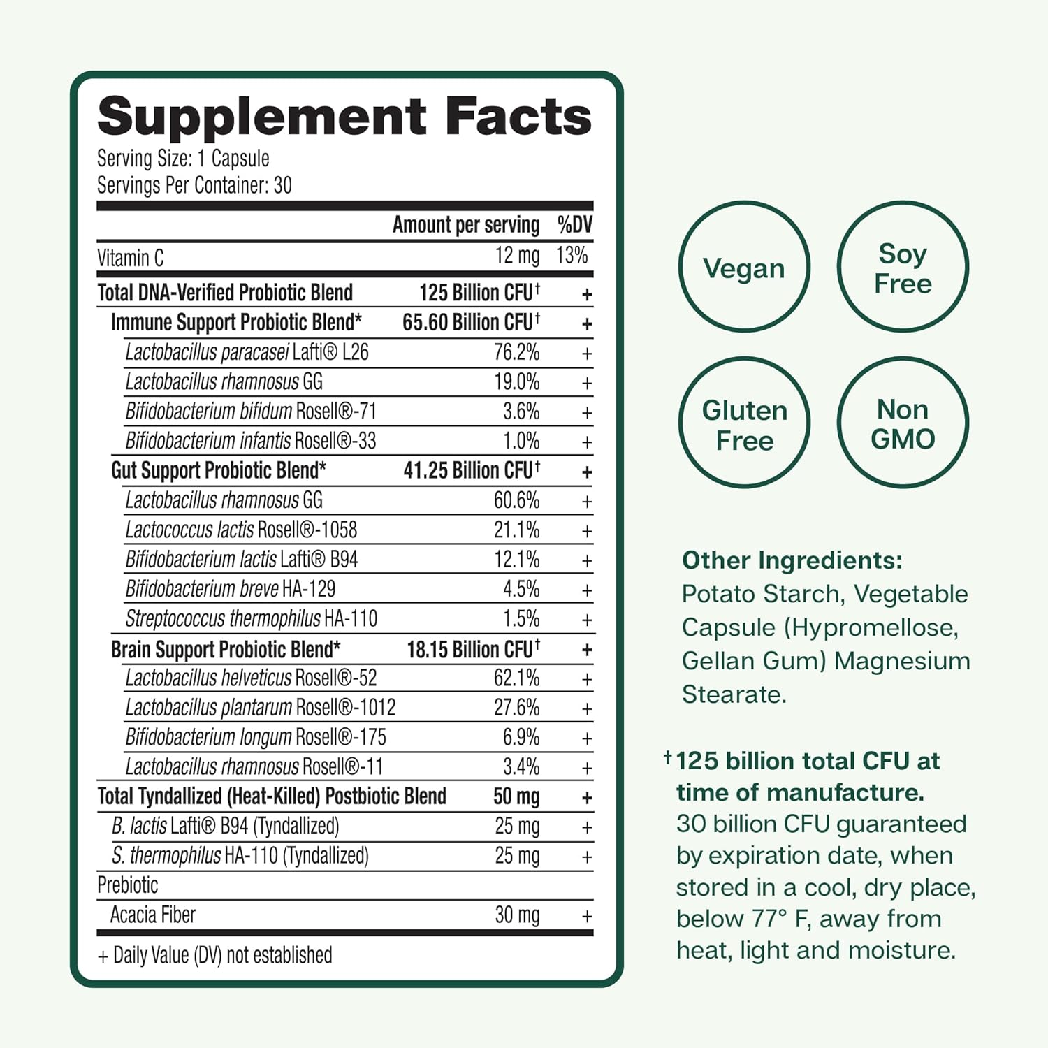 - VEGAN PROBIOTICS FOR WOMEN AND MEN: 12 Probiotic Strains for Digestive Health, Immune Support, and Mood Support - 2 Postbiotic Strains for Immune Support*, plus Prebiotic Fiber - 125 Billion CFU at time of manufacture - 30 capsules per bottle