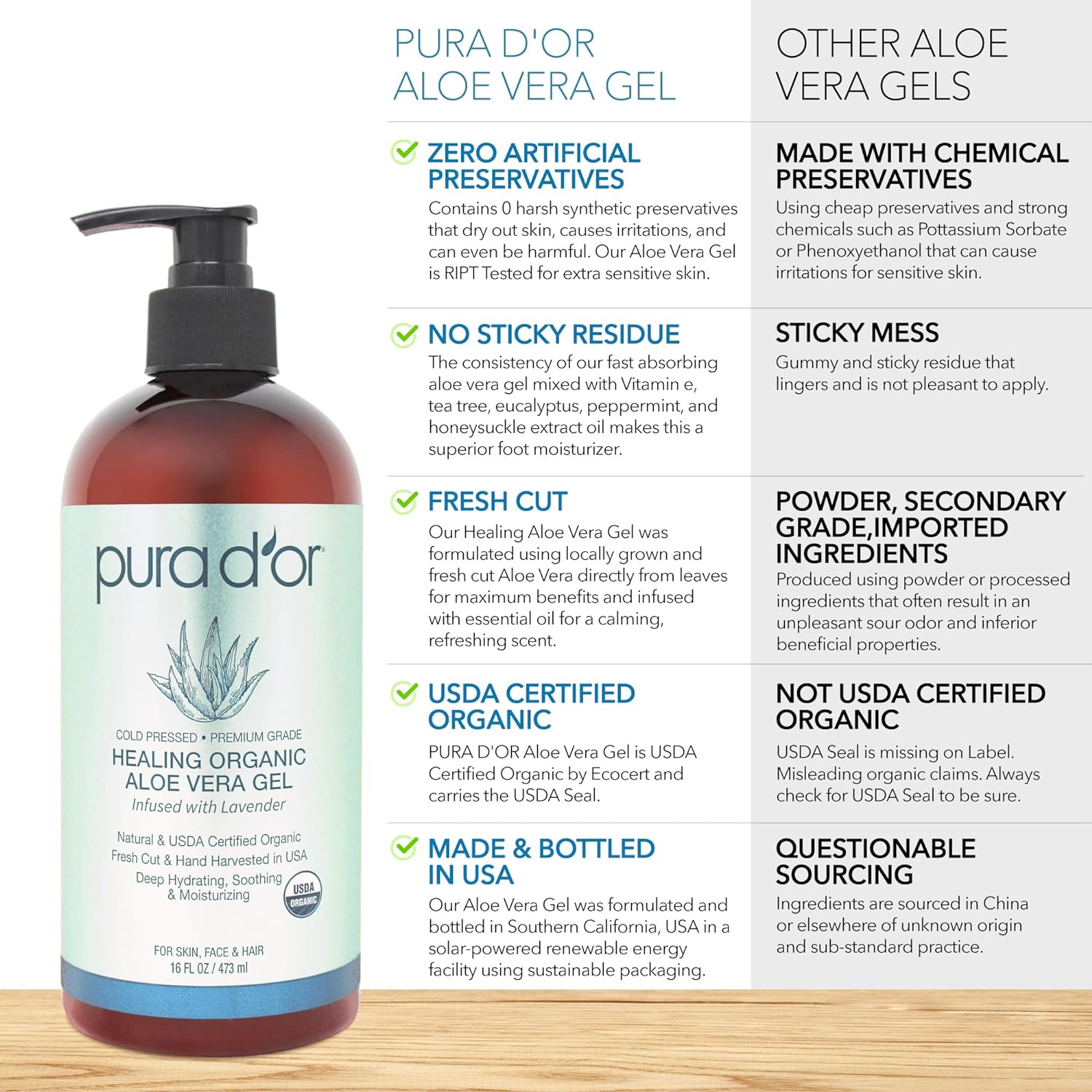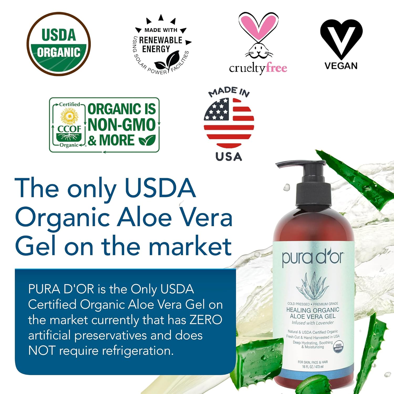 - THE ONLY USDA ORGANIC ALOE VERA GEL ON THE MARKET: PURA D'OR is the Only USDA Certified Organic Aloe Vera Gel on the market currently that has ZERO artificial preservatives and does NOT require refrigeration. Other brands are missing USDA Organic Seal on the Label which means they are not Certified Organic and any Organic claims made elsewhere are misleading and inaccurate. Always check for USDA Seal on Label