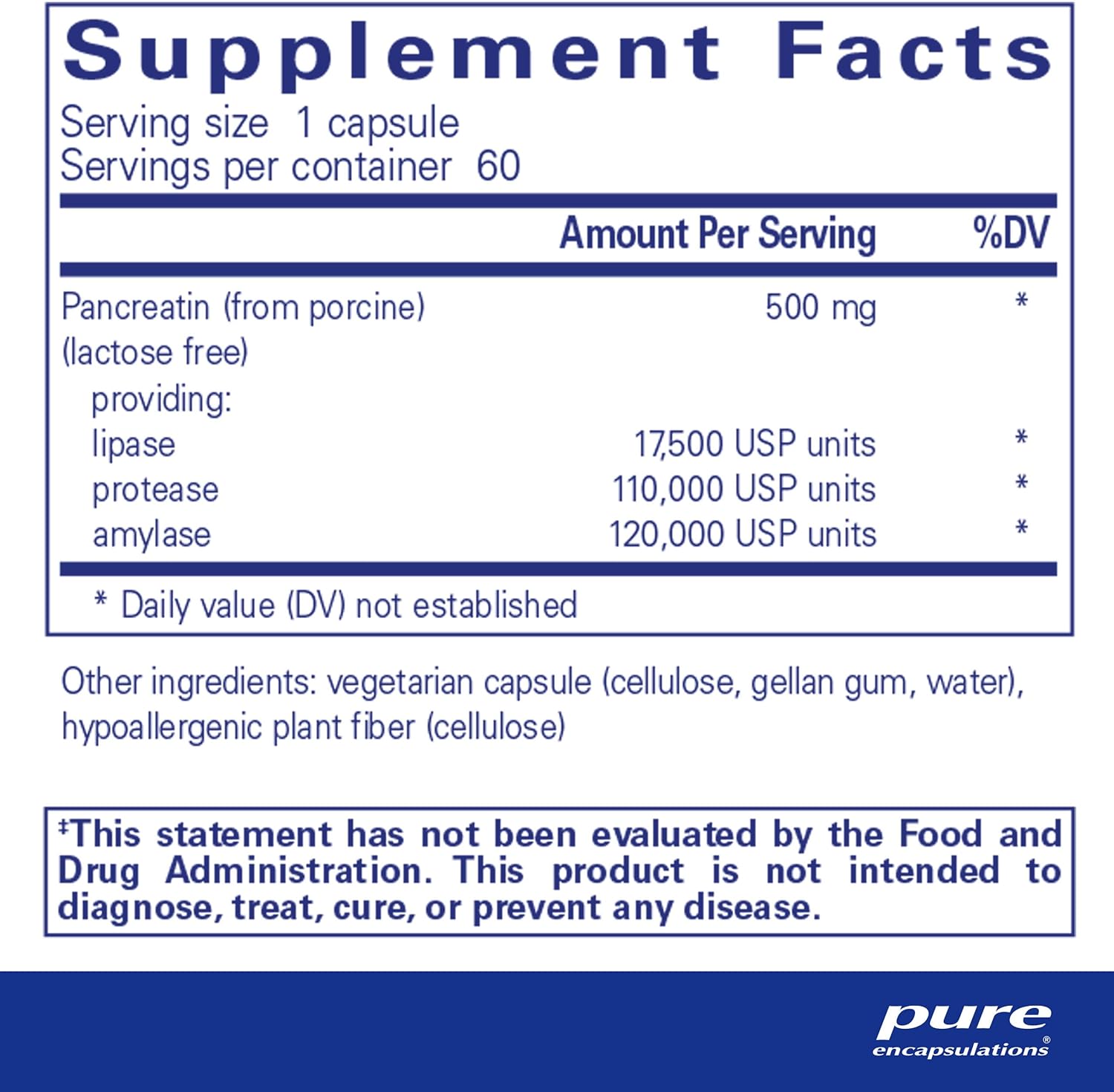 Each serving size (1 vegetarian capsule) contains: Pancreatin (from porcine) (lactose free) 500 mg, Providing: Lipase 17,500 usp units, Protease 110,000 usp units, Amylase 120,000 usp units. Other ingredients: Vegetarian capsule (cellulose, gellan gum, water).