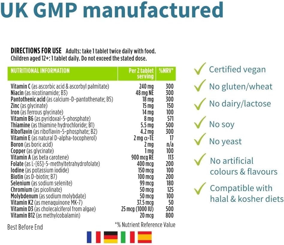 Bulking agents: microcrystalline cellulose, dicalcium phosphate, hydroxypropyl methylcellulose; vitamin C (ascorbic acid, ascorbyl palmitate); ferrous bisglycinate; zinc bisglycinate; nicotinamide; beta carotene; calcium D-pantothenate; menaquinone MK-7; pyridoxal 5-phosphate; cholecalciferol; boric acid; thiamine hydrochloride; riboflavin 5-phosphate; copper bisglycinate; d-alpha-tocopherol; L-[6S]-5-methyltetrahydrofolate; chromium picolinate; sodium selenite; potassium iodide; sodium molybdate; D-biotin; methylcobalamin; anti-caking agent: bambusa bambos (bamboo silica).