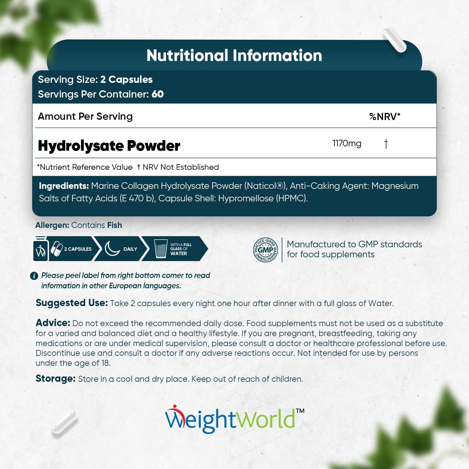 - Hydrolysed Collagen for Maximum Absorption – WeightWorld hydrolysed marine collagen supplements is derived from wild fish that are sustainably sourced from the deep sea for higher quality collagen peptide, that is free from hormones and heavy metals. Our fish collagen supplement contains premium "NATICOL" Type I hydrolysed collagen peptides to ensure higher absorption ratios.