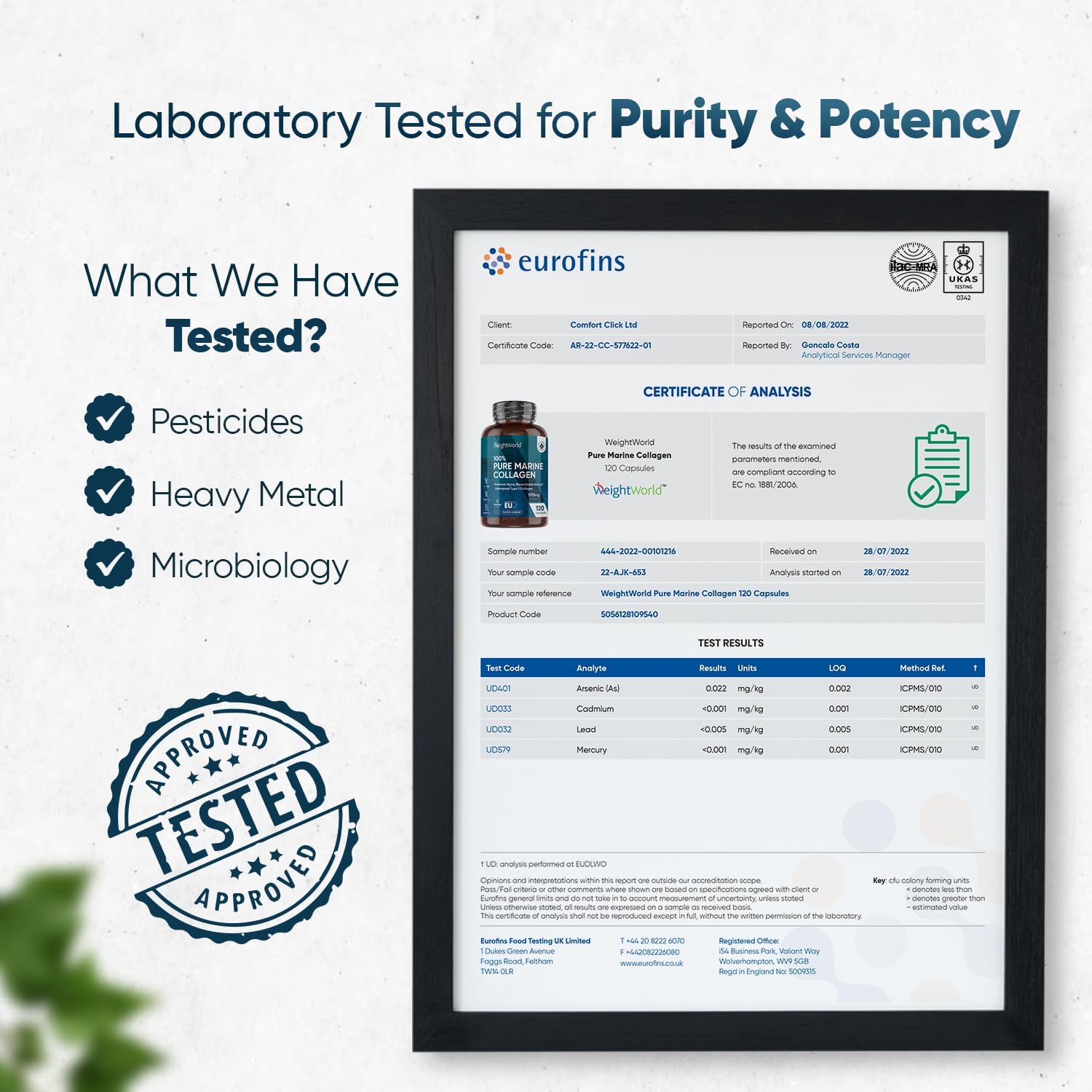 - Third-party Lab-tested - Unlike many collagen supplements, we haven't spared any expense on quality. Each ingredient is quality tested before the manufacturing process begins, every batch of our pure collagen capsules supplement undergoes further rigorous quality testing. Our Hydrolyzed collagen capsules(not pure collagen tablets) have been third party tested for heavy metals & unwanted compounds by one of the best testing facilities, Eurofins.