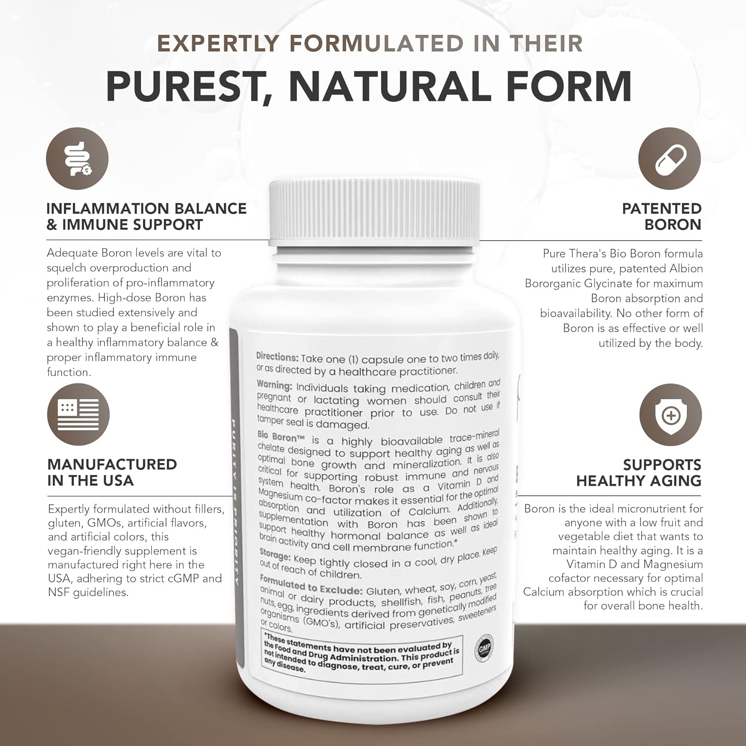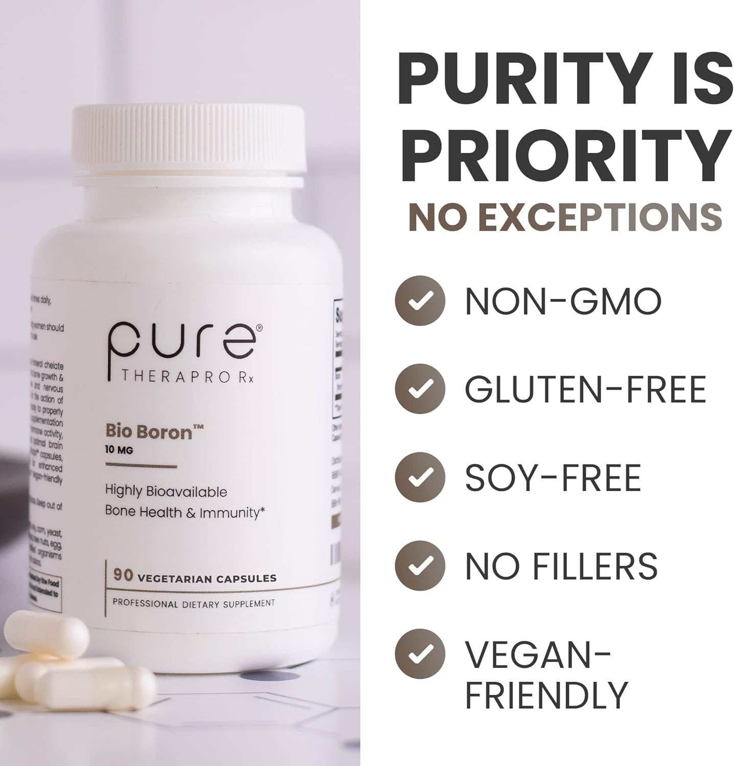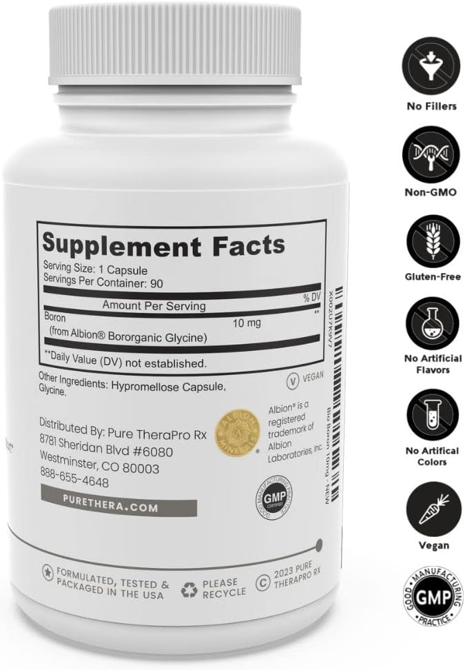 - ๐๐๐๐๐๐ ๐๐๐๐๐๐๐๐๐๐๐๐: Boron can be challenging for the body to absorb. However, Pure TheraPro Rx Bio Boron contains Albion's Bororganic Glycinate that optimizes absorption and bioavailability, ensuring effective supplementation. Boron is an essential nutrient necessary for optimal health. Our Boron supplement for women and men supports optimal bone metabolism, immunity, and nervous system health.