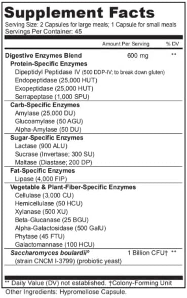 600 mg Full-Spectrum Digestive Enzyme Blend in 2 capsules (see label for a breakdown of all individual vegan digestive enzymes), Lynside® CNCM I-3799 Saccharomyces Boulardii. OTHER INGREDIENTS: Hypromellose (Vegetable Fiber) Capsule.